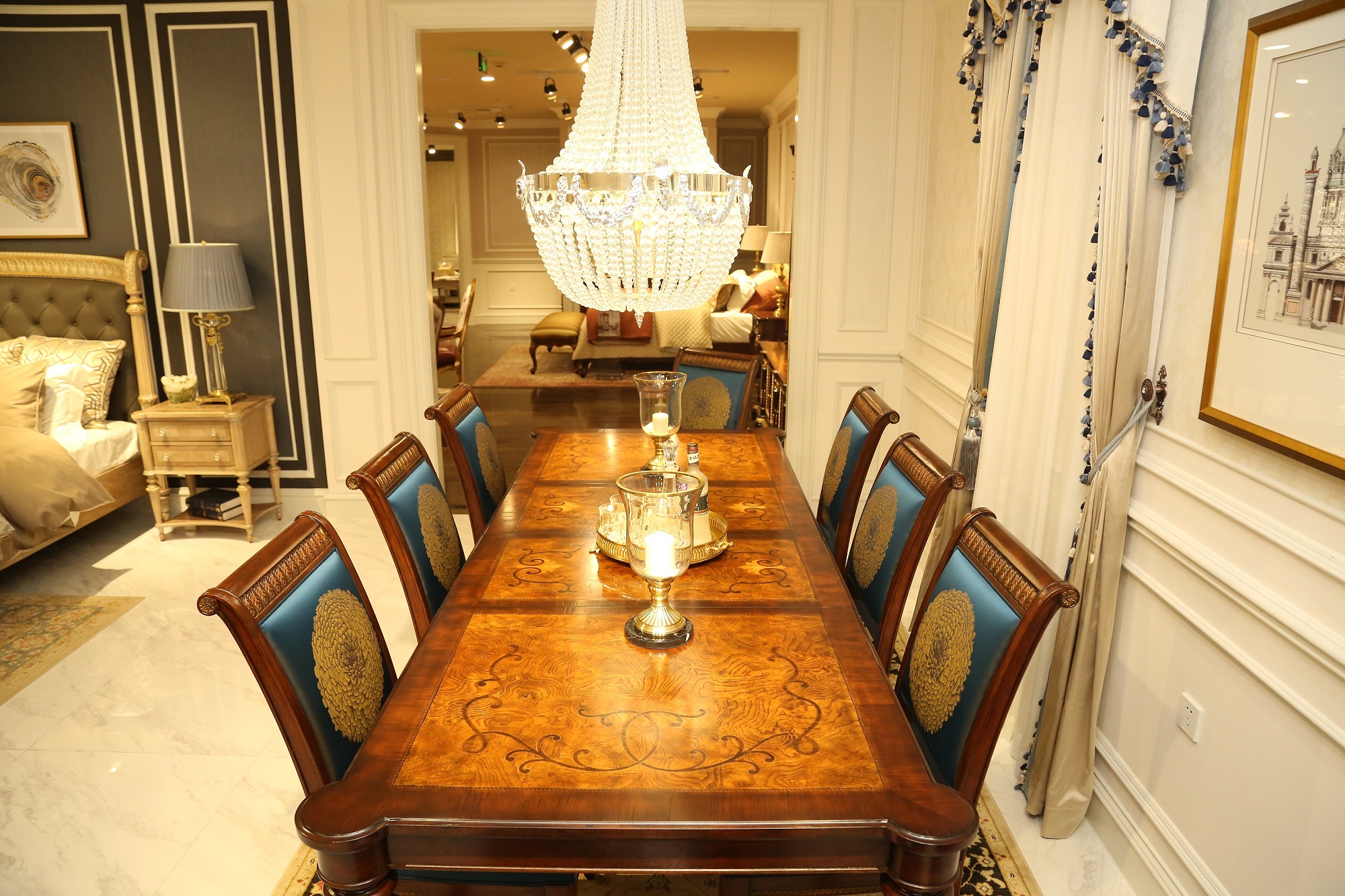 窗明幾凈的展廳分空間細致展示了福溢家居英法意時尚等系列產品,既有歐洲皇庭的奢侈生活;又有法國田園的休閑起居;既有意大利一絲不茍的生活追求;又有時尚輕奢的自由個性。以不同的生活方式去追尋多彩生活。