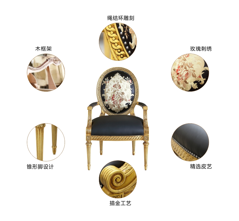 凡爾賽扶手椅參考18世紀(jì)法國路易十六時(shí)期涂金扶手椅古董設(shè)計(jì),并結(jié)合同時(shí)期的圓面背板設(shè)計(jì)。精致的連續(xù)雕刻和貼仿金鉑工藝、錐形腳設(shè)計(jì)無一不彰顯精湛奢華工藝。