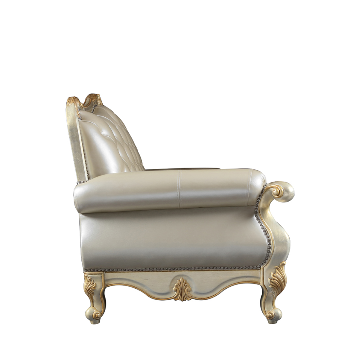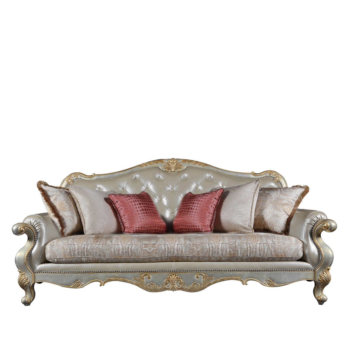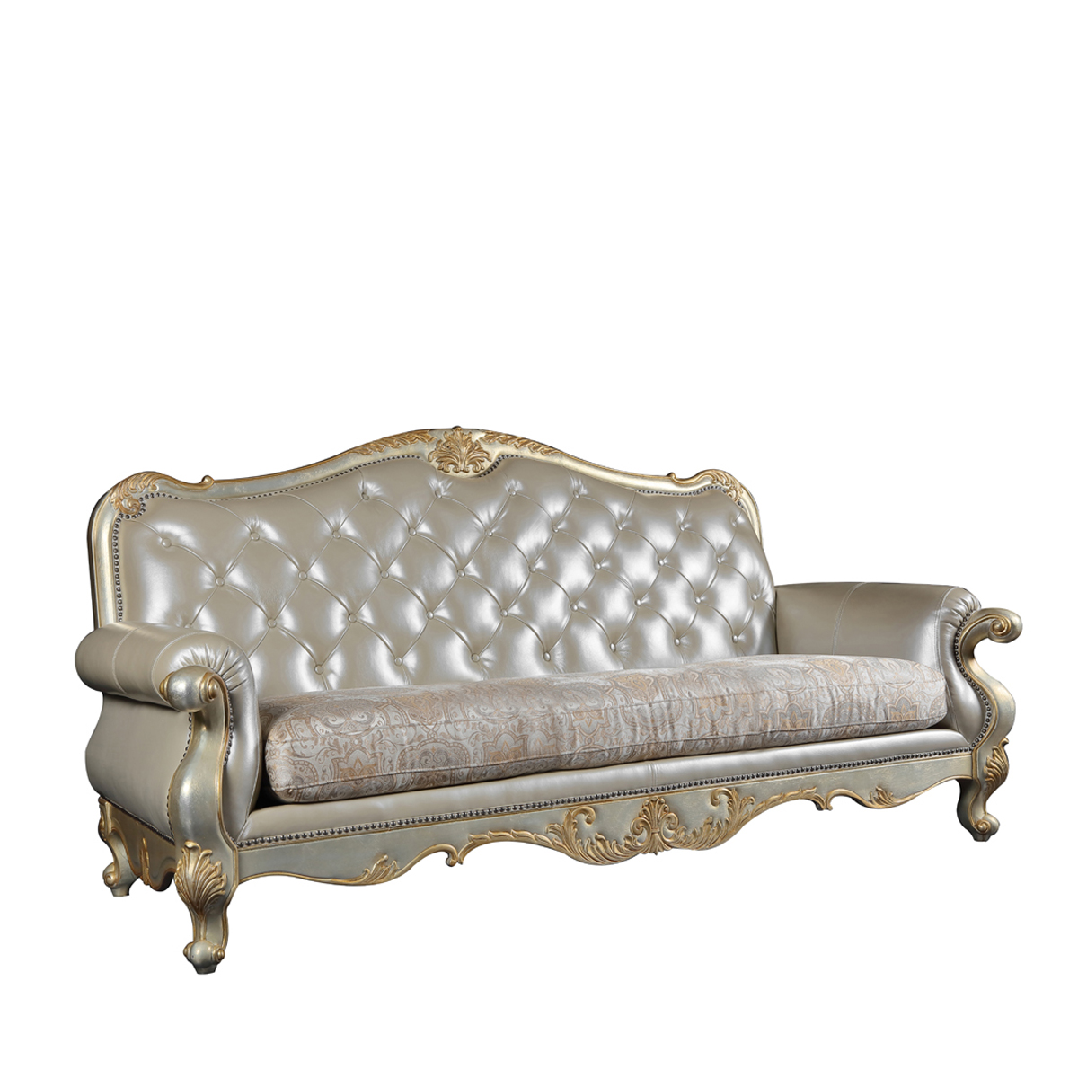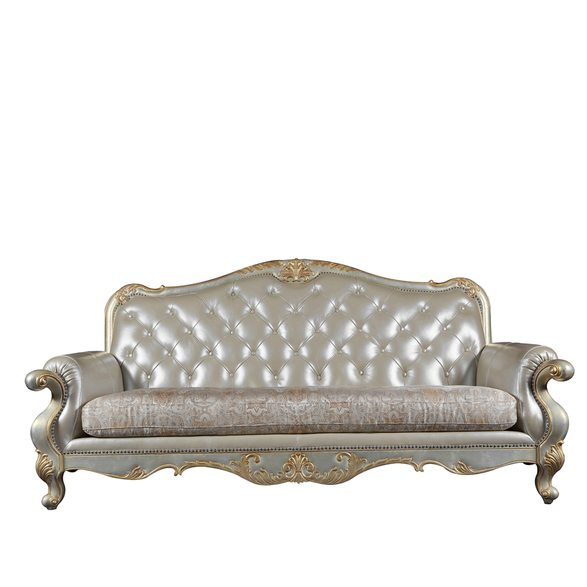 線條型的沙發(fā)造型猶如香頌般高低起伏的音律, 將法式典雅更精致化,貼仿金箔修飾,讓其成為華麗點(diǎn)綴,外卷的扶手提供舒適承托,底部精雕細(xì)琢的花草雕刻展現(xiàn)了匠心獨(dú)運(yùn)的法式浪漫藝韻。