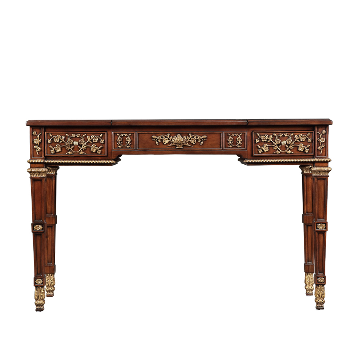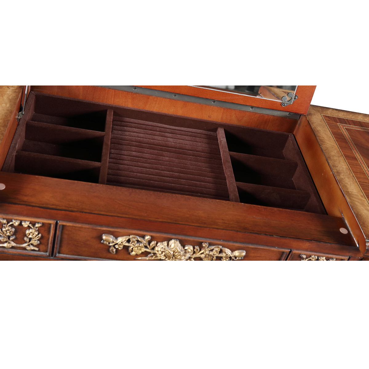 * 結實的連接技術以及描金的工藝 * 鏡子是鍍鋁鏡,始終保持鏡面清晰不會變形; * 三個儲物抽斗,其底部采用硬木實木滑軌; * 腳底部裝有可調腳釘;