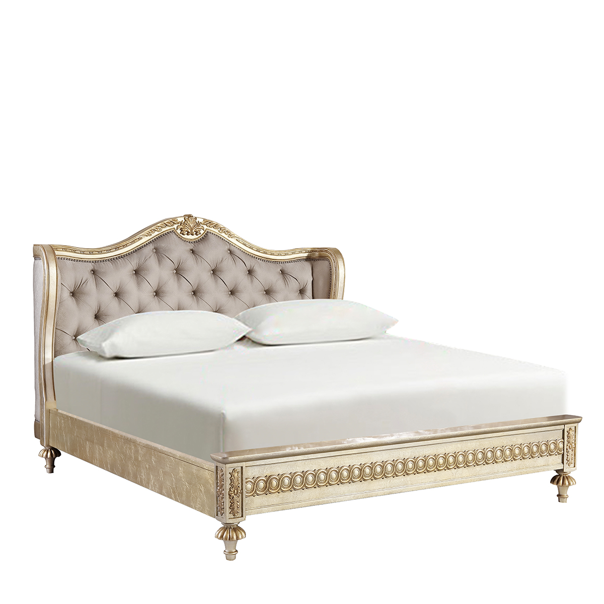 設計靈感源自法國浪漫奢華的凡爾賽宮,采用路易十四時期的太陽花連環雕刻和宛如翅膀擴展形狀的床頭板設計,配以實木花環和卷葉雕刻,表現凡爾賽宮的莊嚴;米黃色溫和的色調選擇,在莊嚴中帶來絲絲浪漫之意。