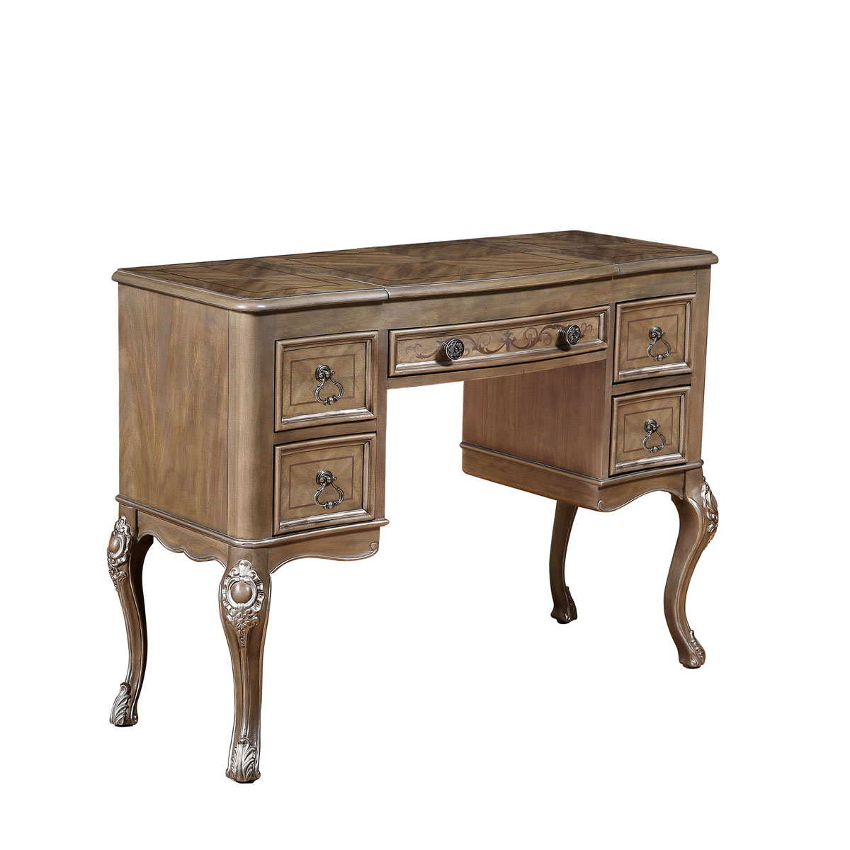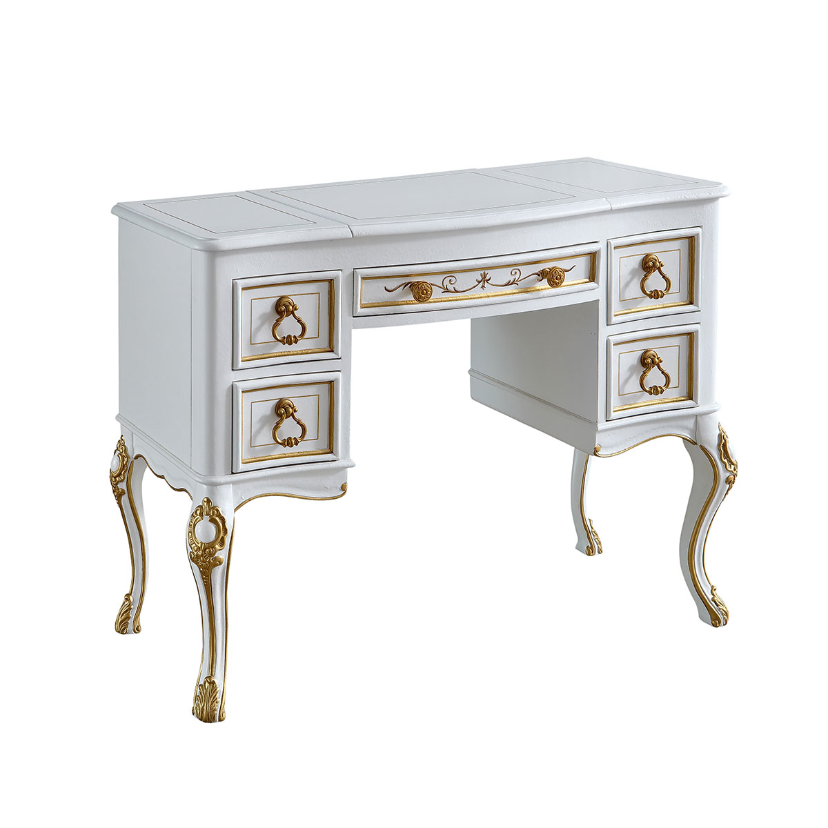 * 4個儲物抽斗,底部采用硬木實木滑軌.中間抽斗的設計可翻下斗面,用來放置鍵盤,抽斗內側有電線孔,抽斗兩邊裝有兩條三節消聲鐵滑軌,滑順耐用; * 中間面板可打開,里面有鏡子和絨布戒指格。 * 底部裝有可調腳釘