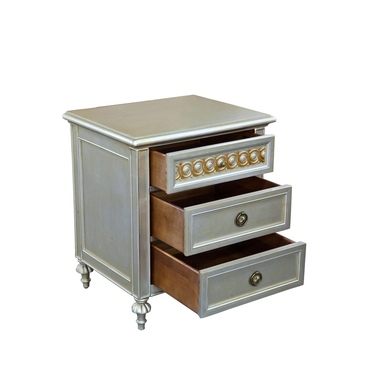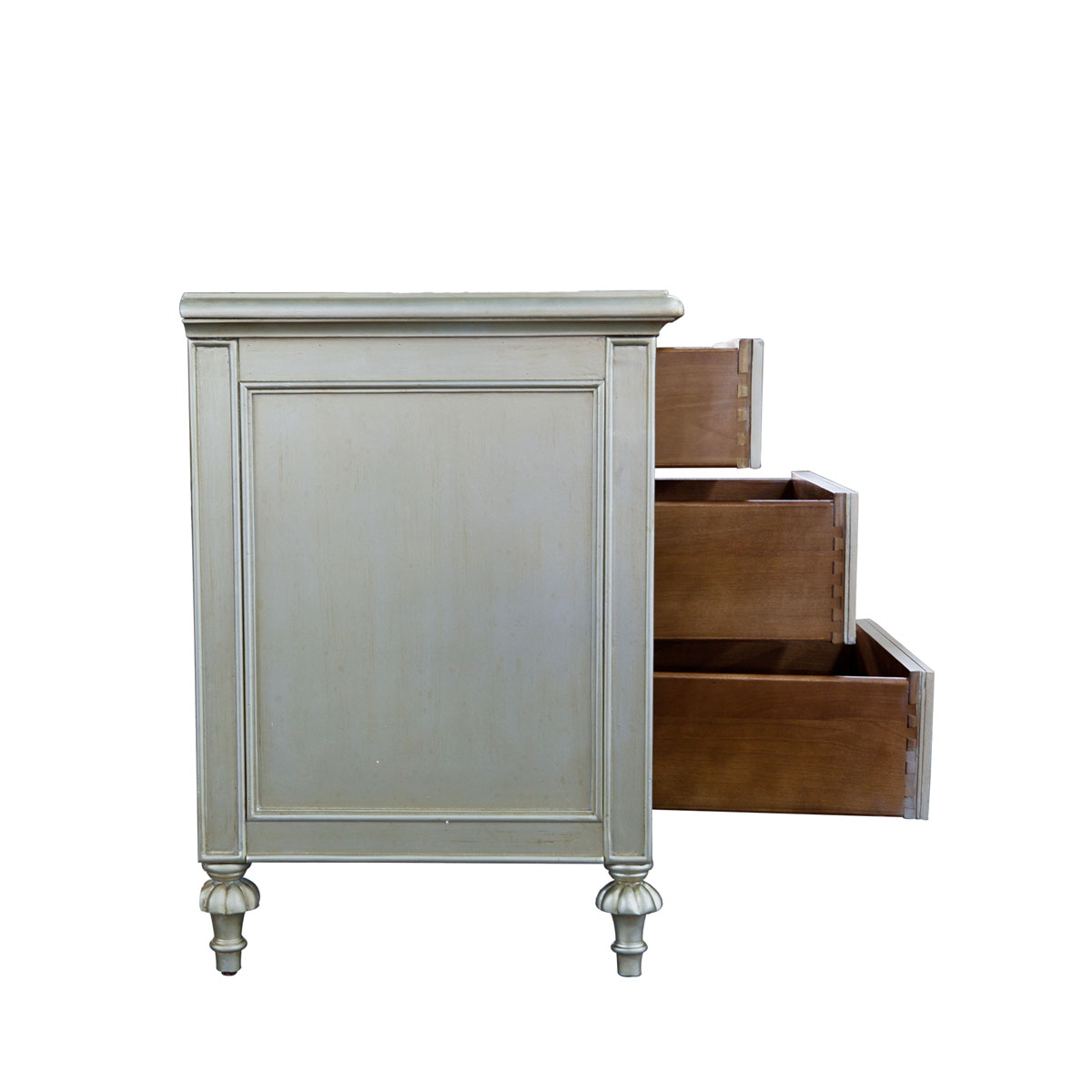 * 為表現(xiàn)法國路易時期的莊嚴和浪漫,以法國凡爾賽宮為設(shè)計元素。使用歌頌路易十四時期的太陽花連環(huán)雕刻,配以優(yōu)雅的花形腿腳設(shè)計、古銅色的球形把手和貼金工藝,完美演繹了法式宮廷家具的奢華尊貴。
