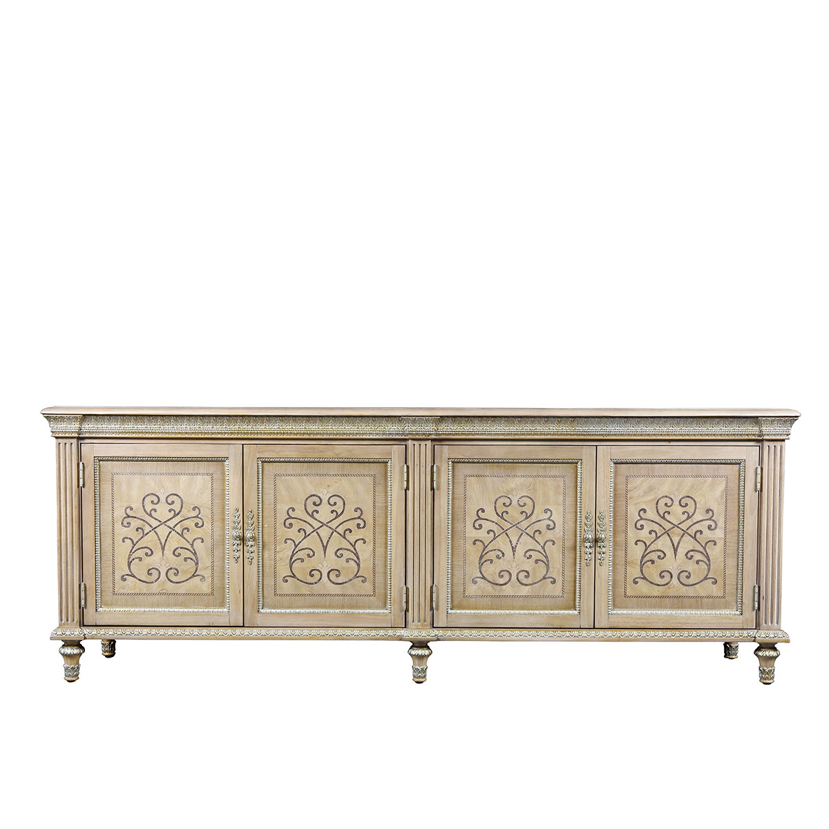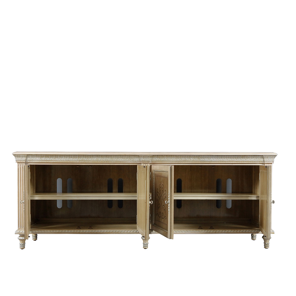 翡冷翠電視柜白栓樹瘤、橡木皮、楓木等多種木皮進行手工拼花彰顯了古老手工技藝的迷人魅力,手工雕刻、木皮拼花都是華美的獨特樣式,傳承經典,彰顯宮廷華麗。