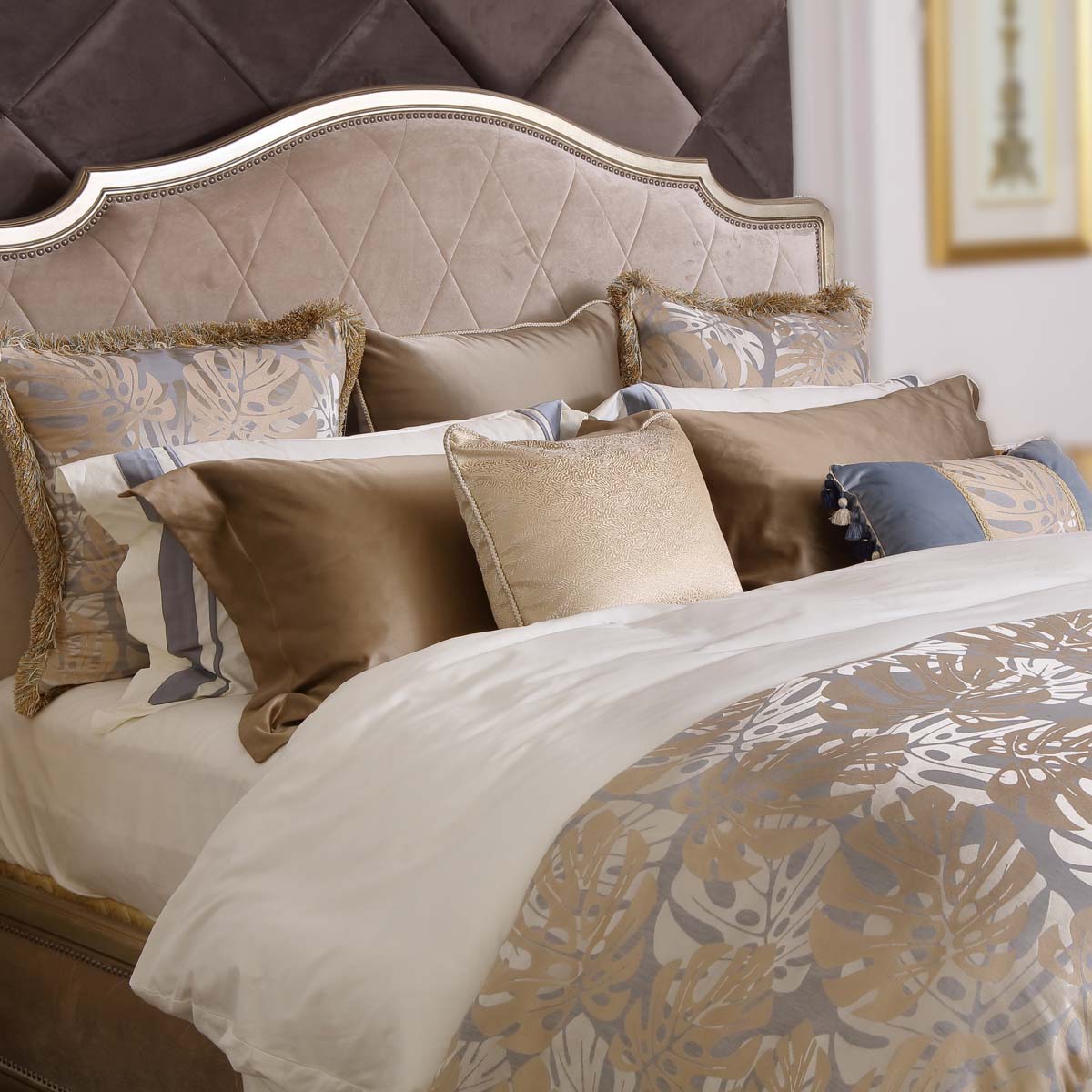 床品四件套:1套;裝飾抱枕A: 650*650MM 2個;裝飾抱枕B:650*650MM 1個;裝飾長枕:750*480MM 2個;裝飾抱枕C:550*350MM 1個;裝飾抱枕D:480*480MM 1個;床尾搭毯:2500*2500MM 1條;