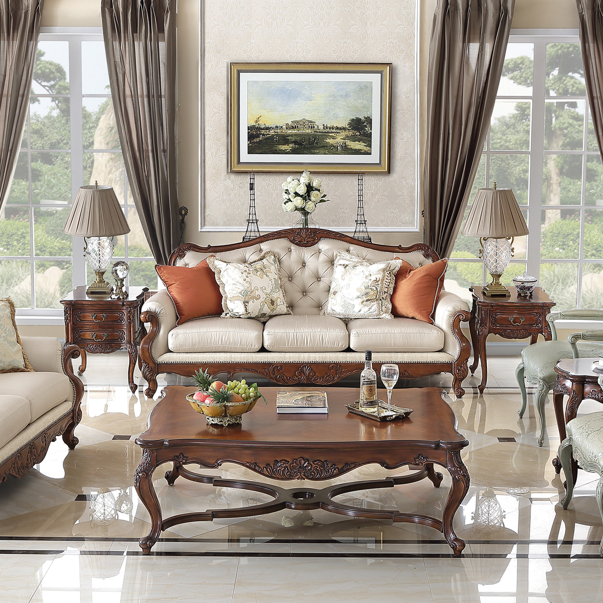 * 浪漫的香頌猶如歷史悠久的杜樂麗花園般,每每散發(fā)著其獨特的韻味。為表現(xiàn)杜樂麗花園的休閑愜意,使用花環(huán)、藤蔓和卷葉造型的實木手工雕刻,配以法式彎腿、木皮貼面和哥特式風格大圓窗中的骨架設(shè)計,營造出濃情蜜意的法式生活空間。