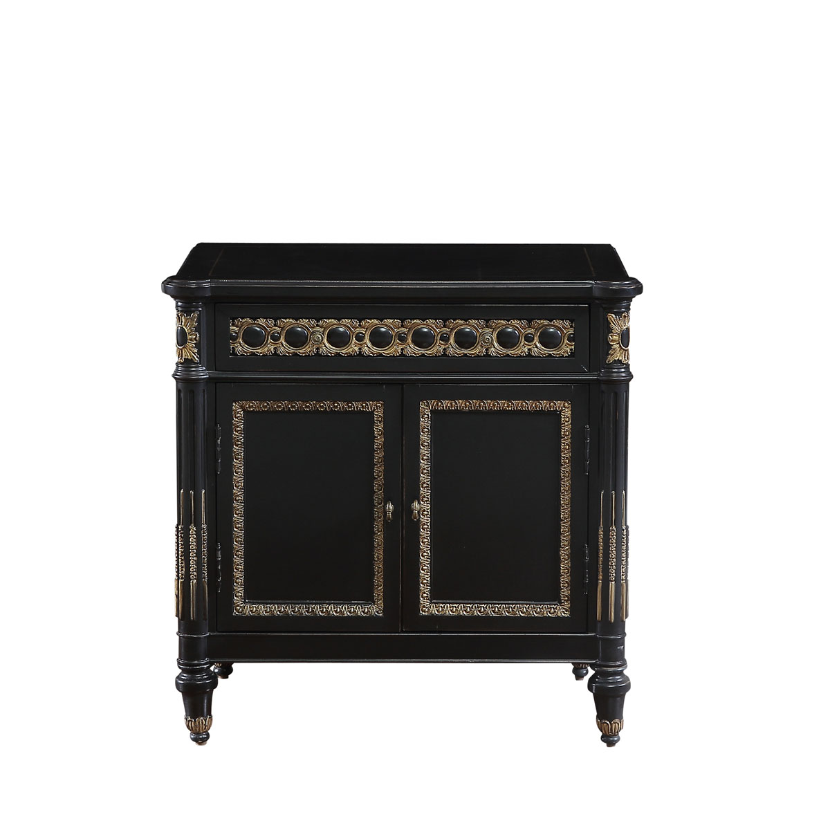 * 手工雕刻的工藝細節; * 結實的連接技術 * 一個儲物抽斗,而在其底部采用英式經典硬木實木滑軌設計; *門內一塊活動層板 * 仿金箔工藝配上十八道油漆工藝讓每一件家具都是工藝品;
