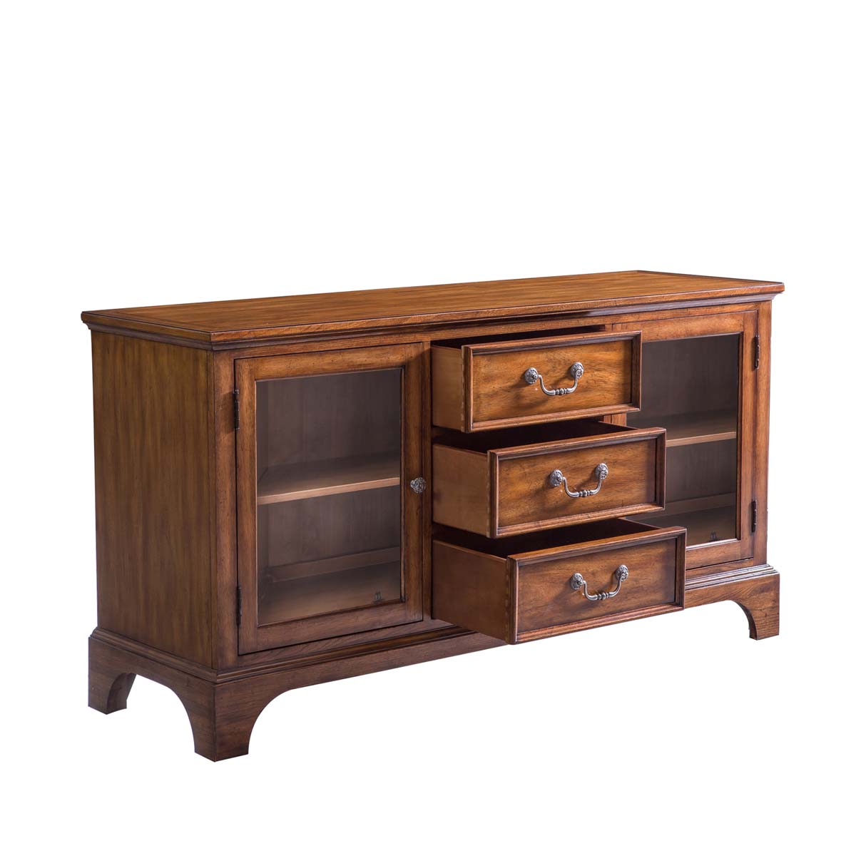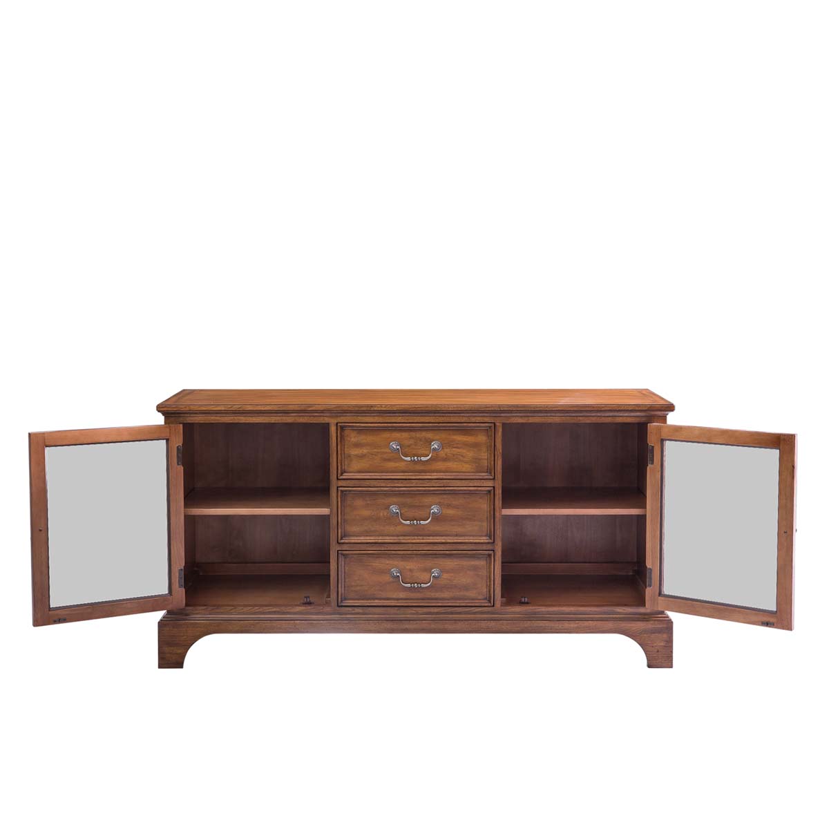 * 3個儲物抽斗,采用硬木實木滑軌設計; * 兩邊實木框玻璃門,門內(nèi)各帶一塊木制活動層板 * 腳底部裝有可調(diào)整的腳釘;