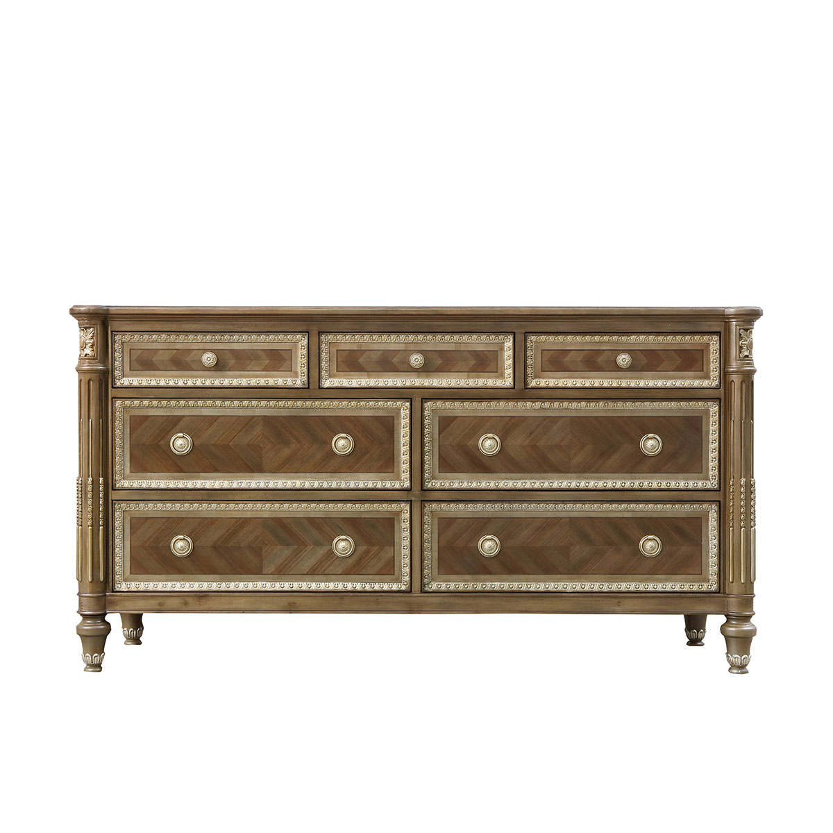 * 為表現(xiàn)法國路易時期的莊嚴和浪漫,以法國凡爾賽宮為設(shè)計元素。使用歌頌路易十四時期的太陽花雕刻,顯示其王權(quán)穩(wěn)固地位的錐形腿腳設(shè)計,配以鉆石圖案的木皮貼面、古銅色的球形把手和貼金工藝,完美演繹了法式宮廷家具的奢華尊貴。