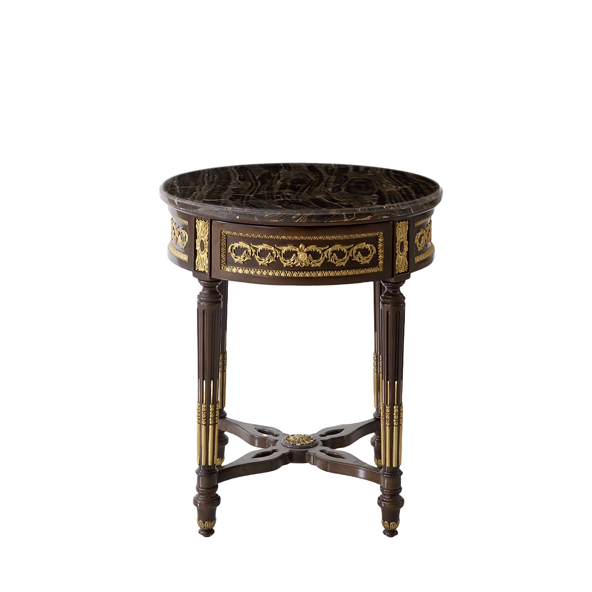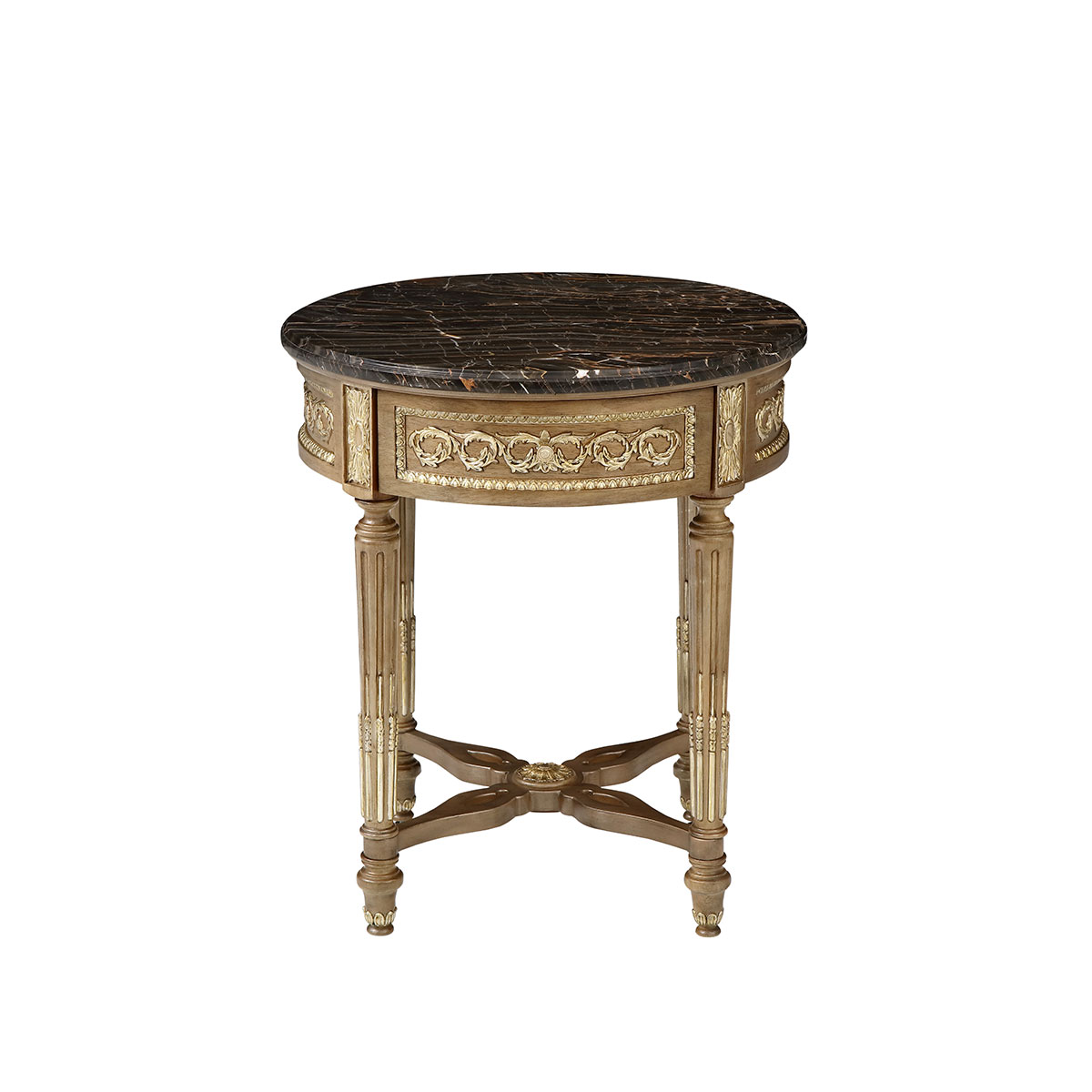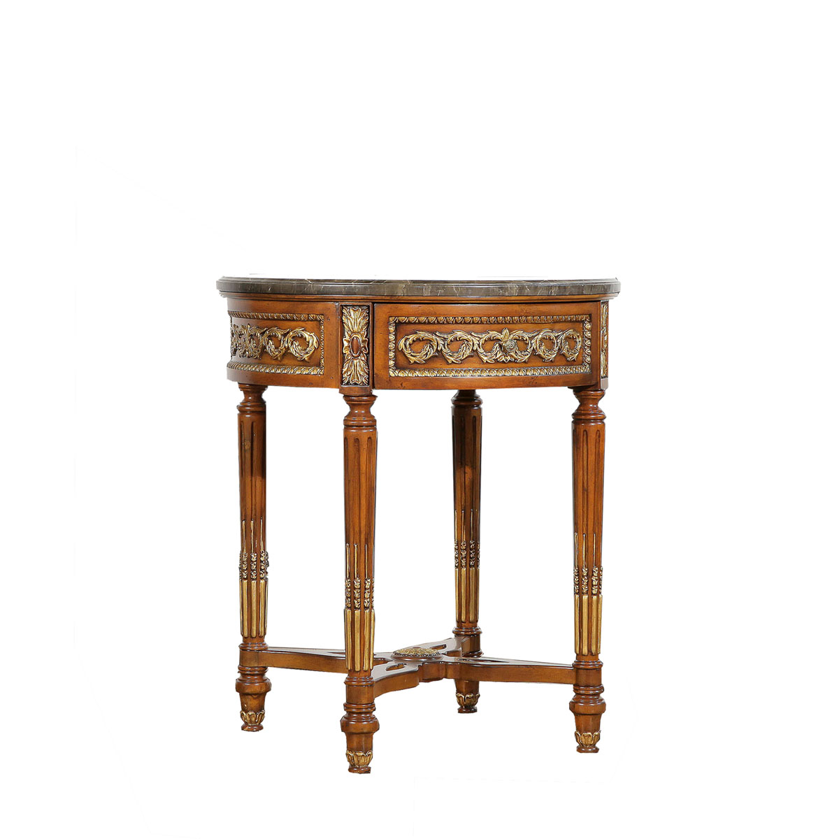 * 為表現(xiàn)法國(guó)路易時(shí)期的莊嚴(yán)和浪漫,以法國(guó)凡爾賽宮為設(shè)計(jì)元素。使用歌頌路易十四時(shí)期的太陽(yáng)花連環(huán)雕刻,顯示其王權(quán)穩(wěn)固地位的錐形腿腳設(shè)計(jì);配以哥特式建筑中的大圓窗骨架設(shè)計(jì)、珍稀大理石臺(tái)面、建筑柱雕刻與絢麗的貼金工藝,完美演繹了法式宮廷家具的奢華尊貴。
