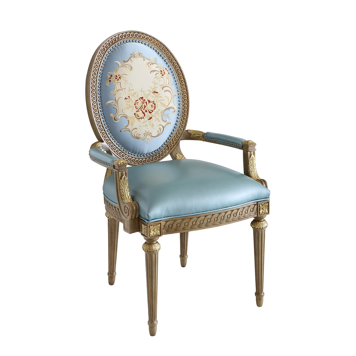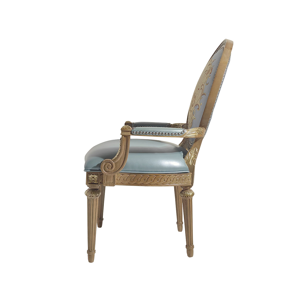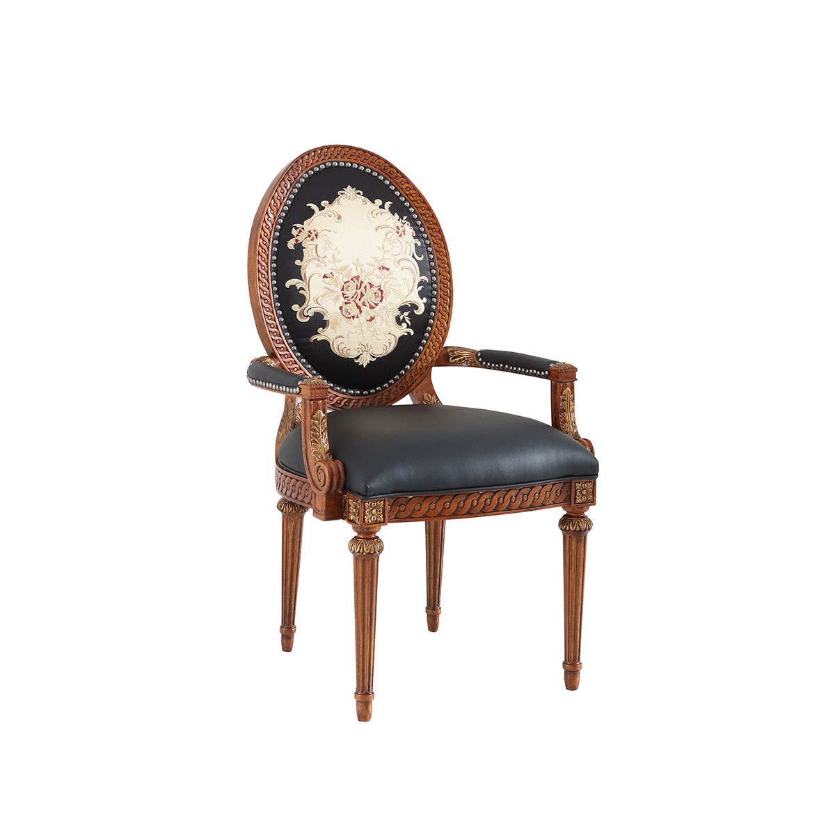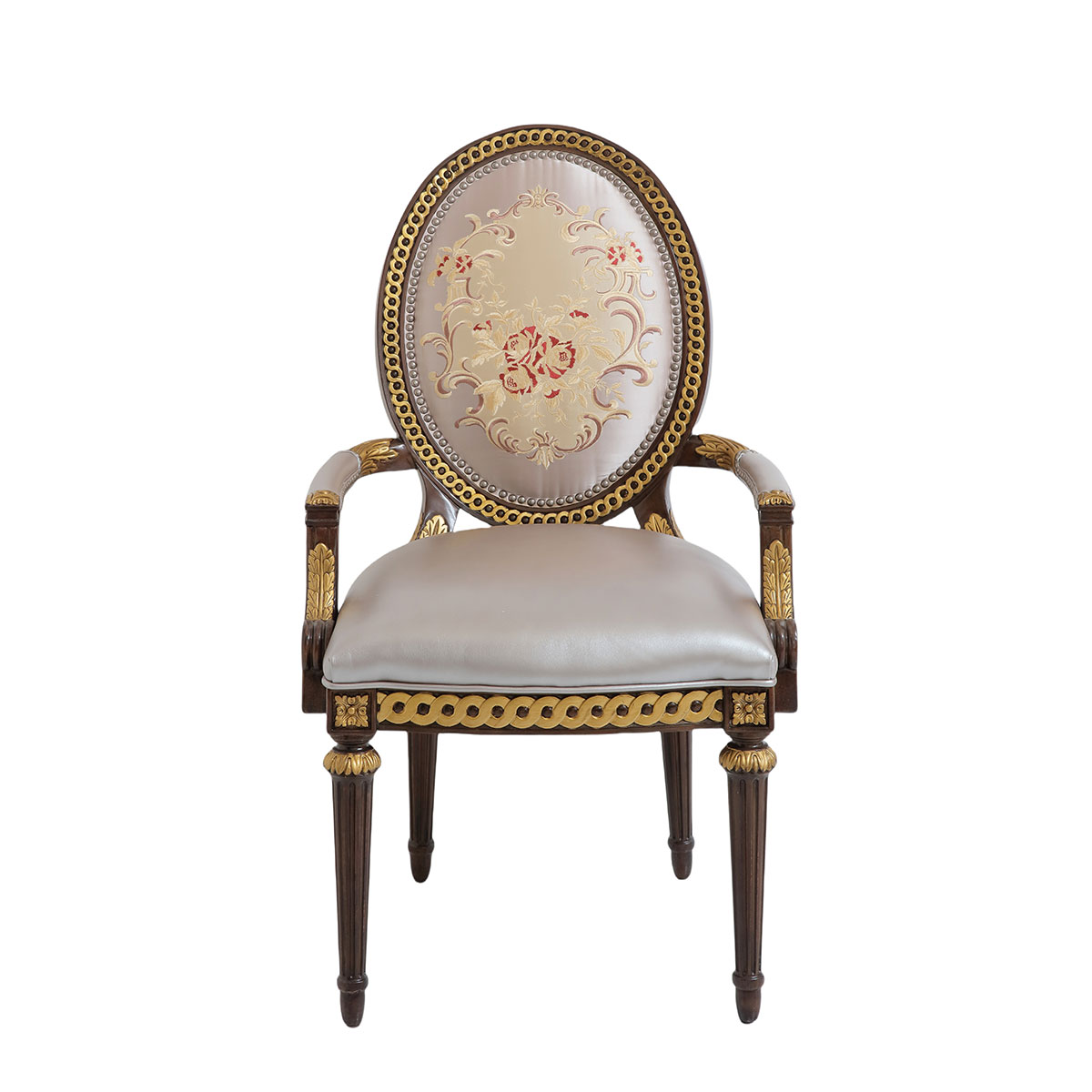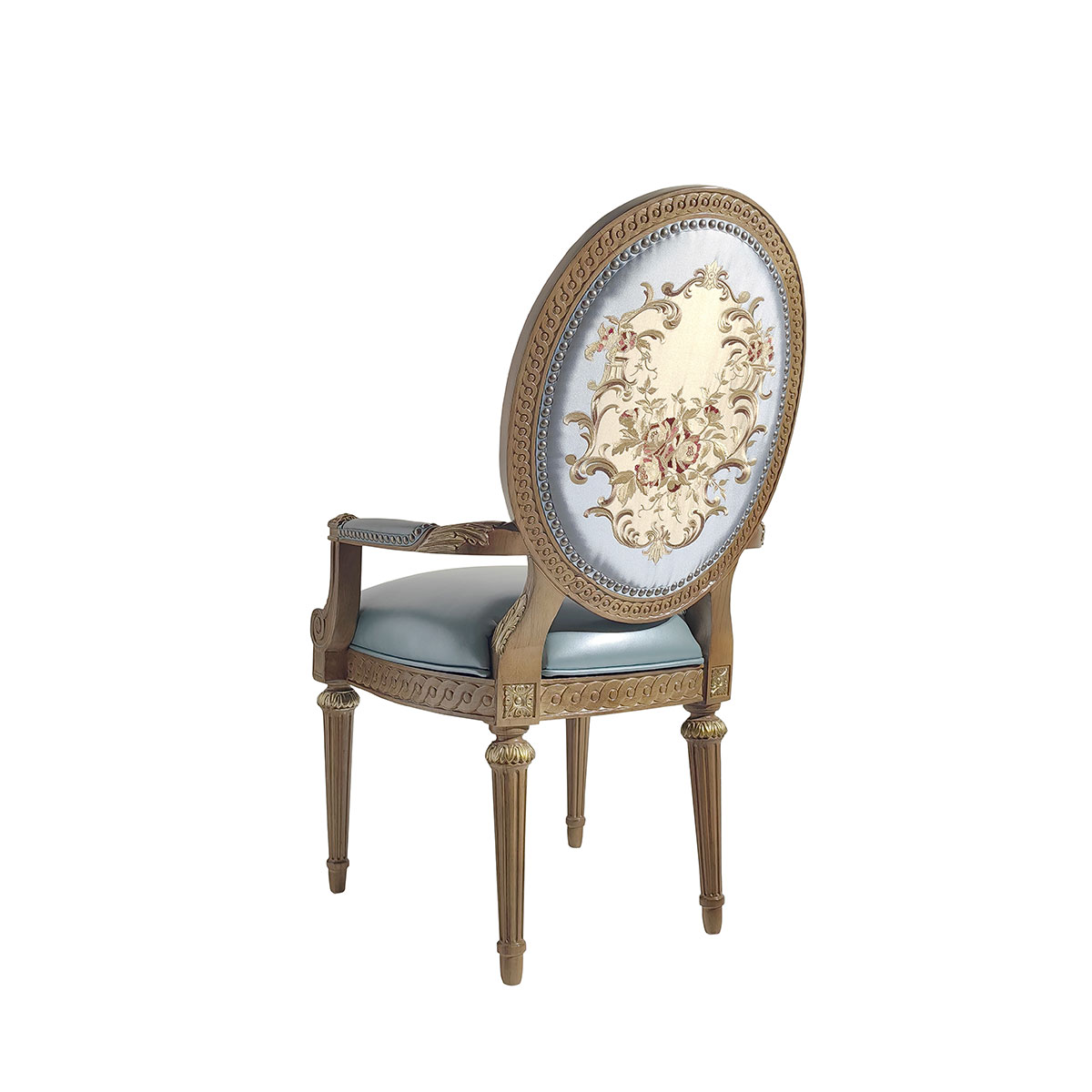參考18世紀法國路易十六時期涂金扶手椅古董設計,并結(jié)合同時期的圓面背板設計。配上精致的連續(xù)雕刻和貼金鉑工藝、錐形腳設計、觸感舒適的布藝和包有豐厚的填充物坐墊和靠背。
