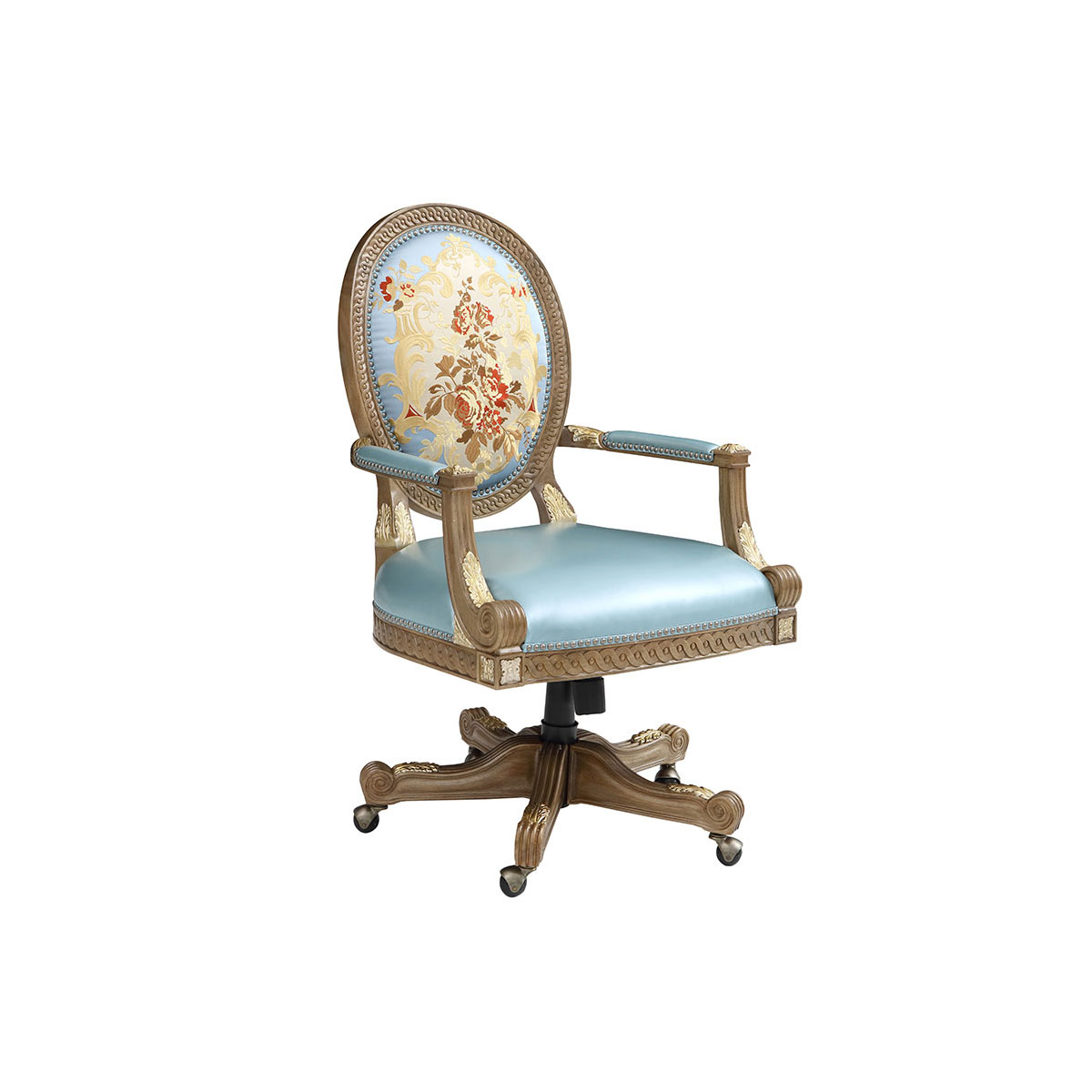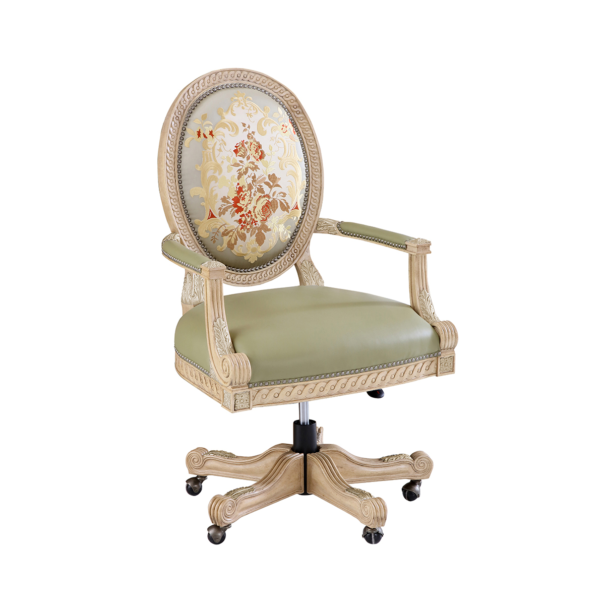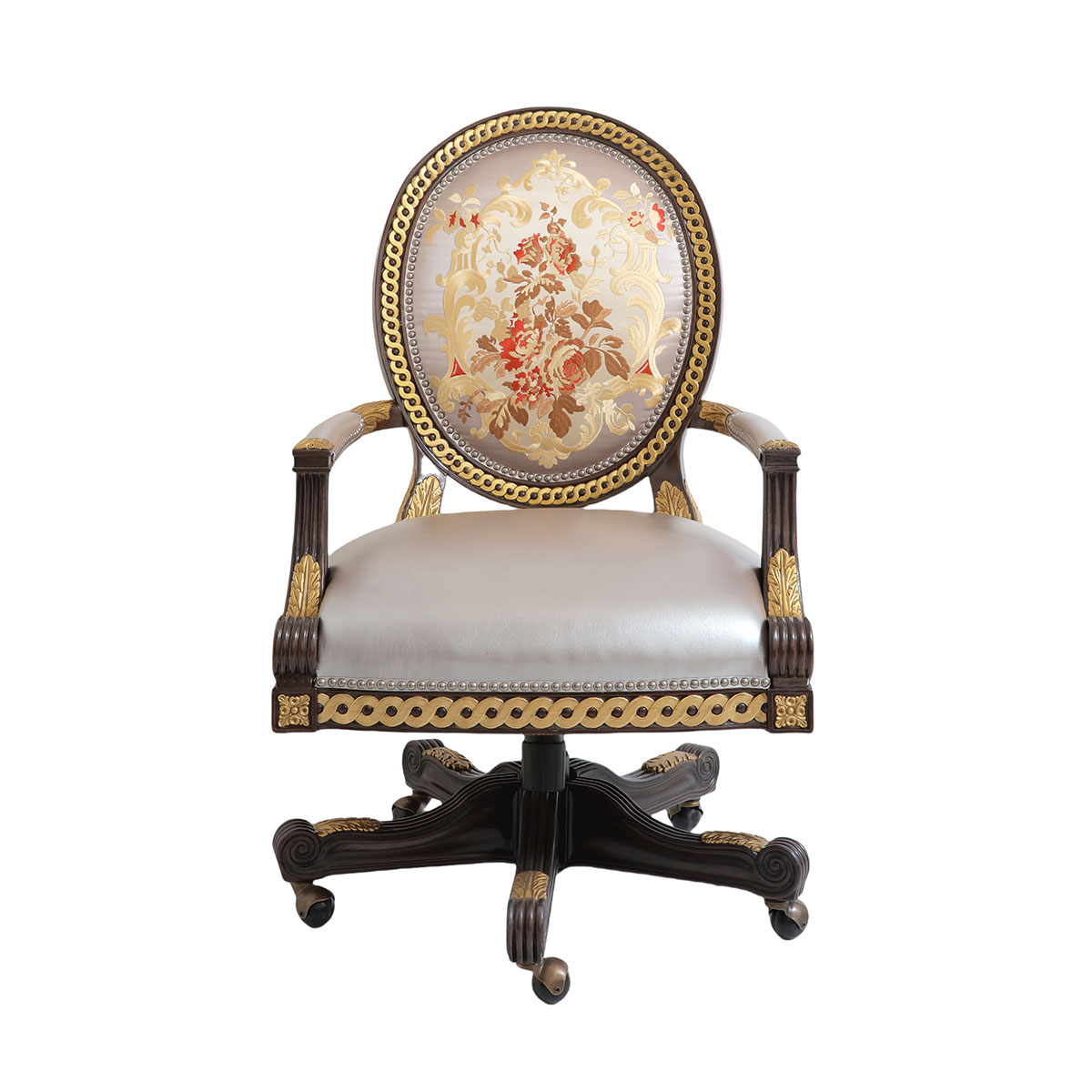 參考18世紀(jì)法國路易十六時期涂金扶手椅古董設(shè)計(jì),并結(jié)合同時期的圓面背板設(shè)計(jì)。配上精致的連續(xù)雕刻和貼金鉑工藝、錐形腳設(shè)計(jì)、觸感舒適的布藝和包有豐厚的填充物坐墊和靠背。