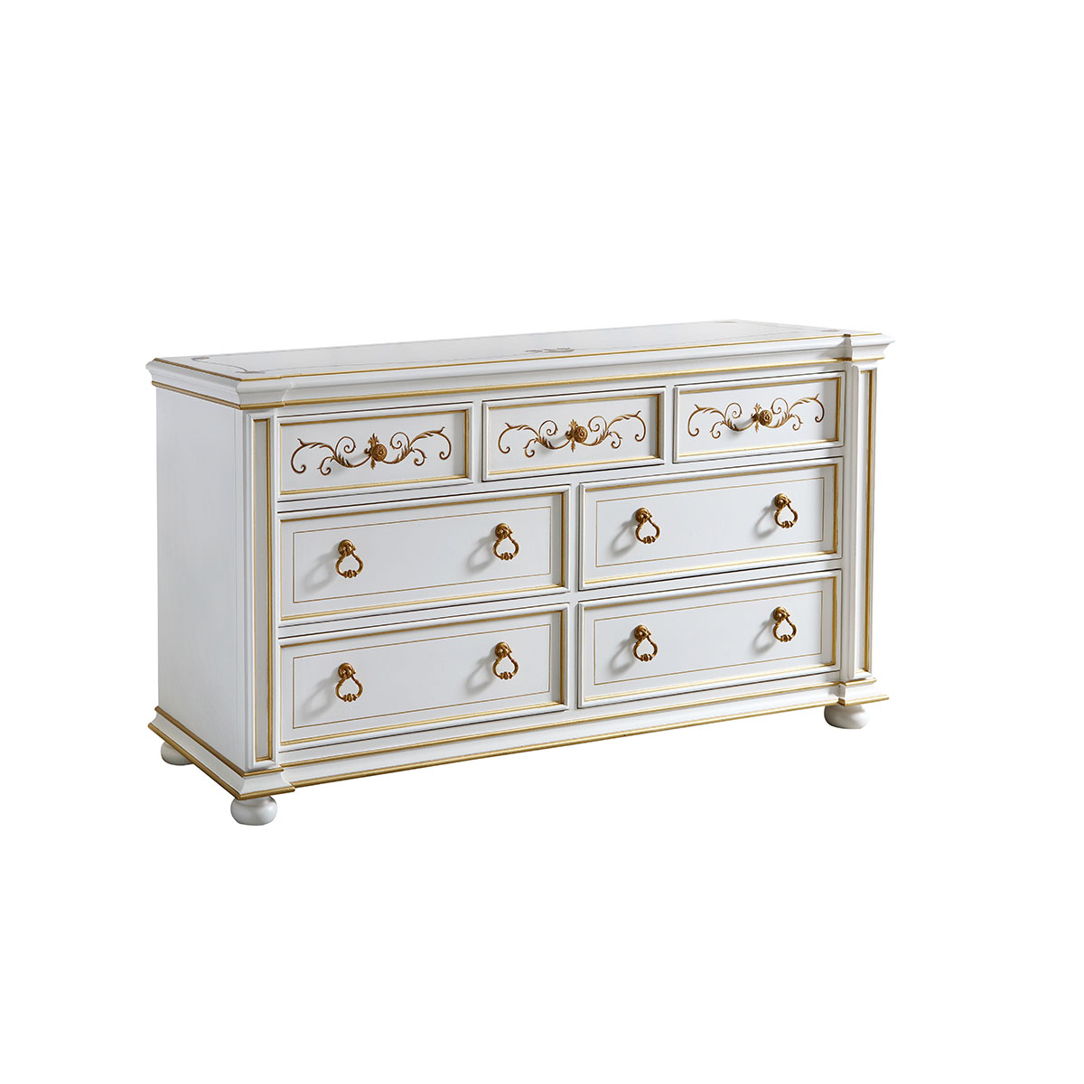 以意大利美麗而古老的城市維羅納為設計靈感,采用了清新動人的花草手繪與帶仿古效果的色澤痕跡,來表現出藝術家具獨特的氣質和內涵,配以閃耀的涂金工藝與古董白配色,精彩演繹了意大利人對奢華絢麗的寵愛。