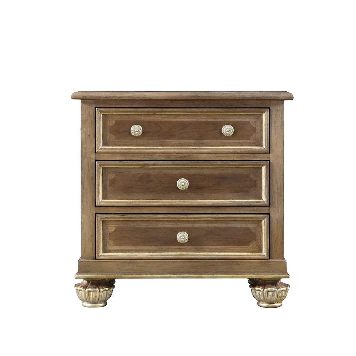 * 手工拼花藤蔓效果,用多種上等木皮拼制而成 * 三個儲物斗,底部采用經典的硬木實木滑軌; * 腳腳底部裝有可調腳釘;