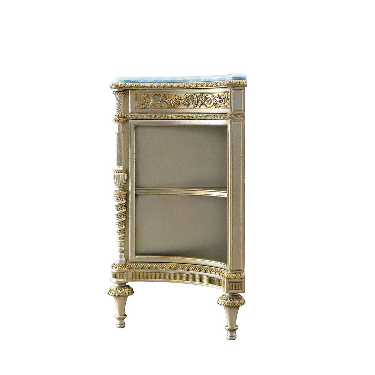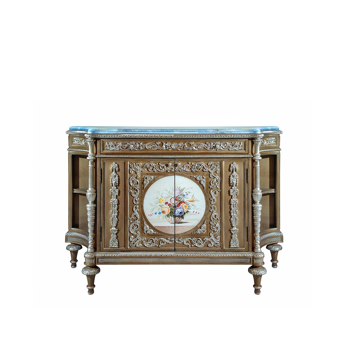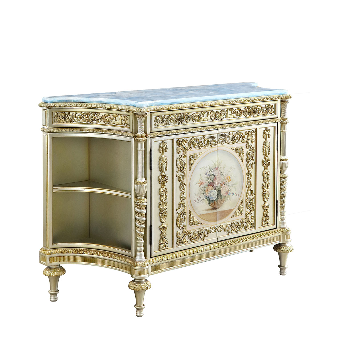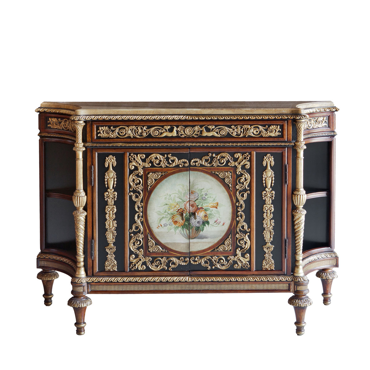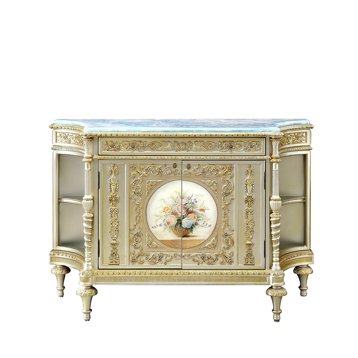 * 這是設(shè)計意念來自于英國溫莎堡中安妮女王時期的走廊柜。柜門上的花草彩繪是安妮女王喜歡觀賞園藝的寫照。羅馬短劍裝飾花紋,則表現(xiàn)軍隊的強悍和靈活。配上精致的手工雕刻細節(jié)和貼金工藝,是豪華系列溫莎堡英式走廊柜的特色。