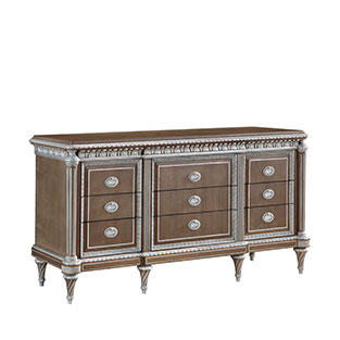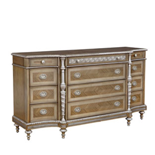 * 以英國溫莎城堡為設(shè)計靈感,通過頂部的皇冠裝飾、手工實(shí)木雕刻的茛苕裝飾紋及優(yōu)雅的孤線設(shè)計,表現(xiàn)出女王的優(yōu)雅和高貴。配上絢麗耀眼的貼金箔工藝,完美演繹了英式宮廷家具的奢華浪漫,可謂是極具典藏價值的傳世之作。
