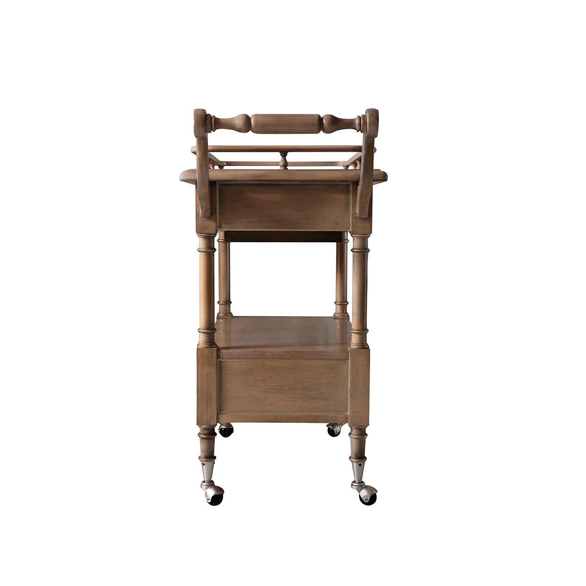 * 二個儲物抽斗,底部采用經典的硬木實木滑軌 * 頂上有護邊帶推手,底下帶腳輪,中間帶掛酒杯的木制瓶架。