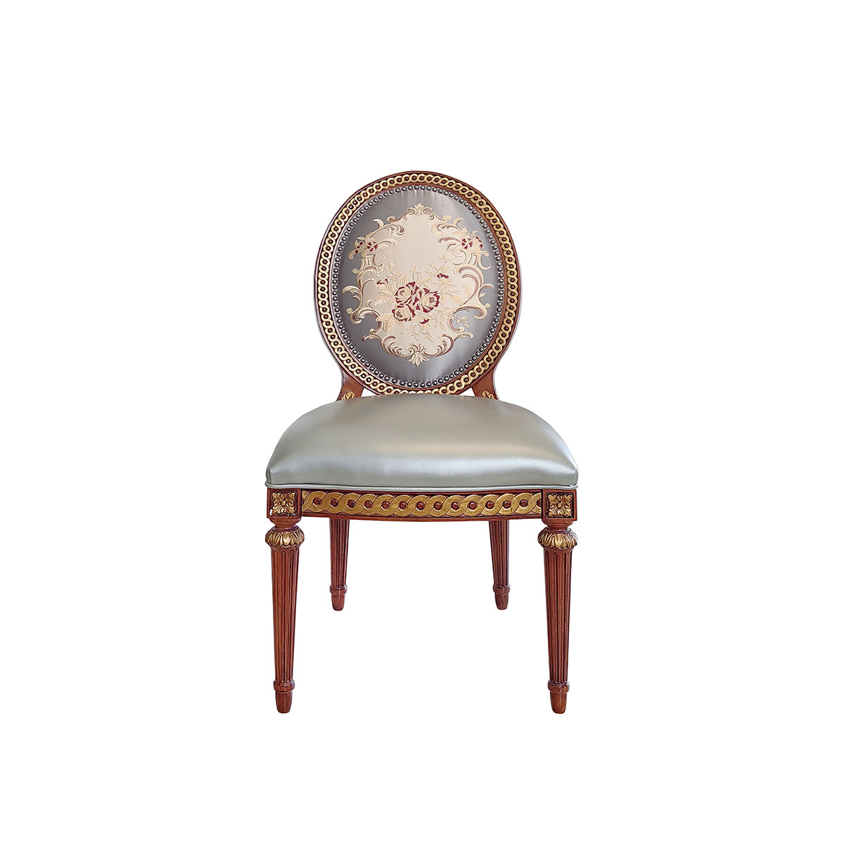 參考18世紀(jì)法國路易十六時(shí)期涂金扶手椅古董設(shè)計(jì),并結(jié)合同時(shí)期的圓面背板設(shè)計(jì)。配上精致的連續(xù)雕刻和貼金鉑工藝、錐形腳設(shè)計(jì)、觸感舒適的布藝和包有豐厚的填充物坐墊和靠背。