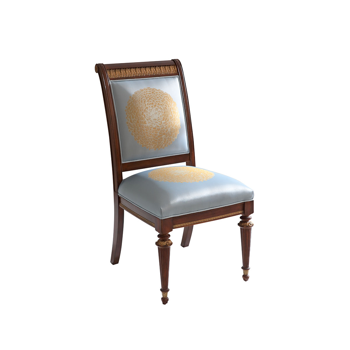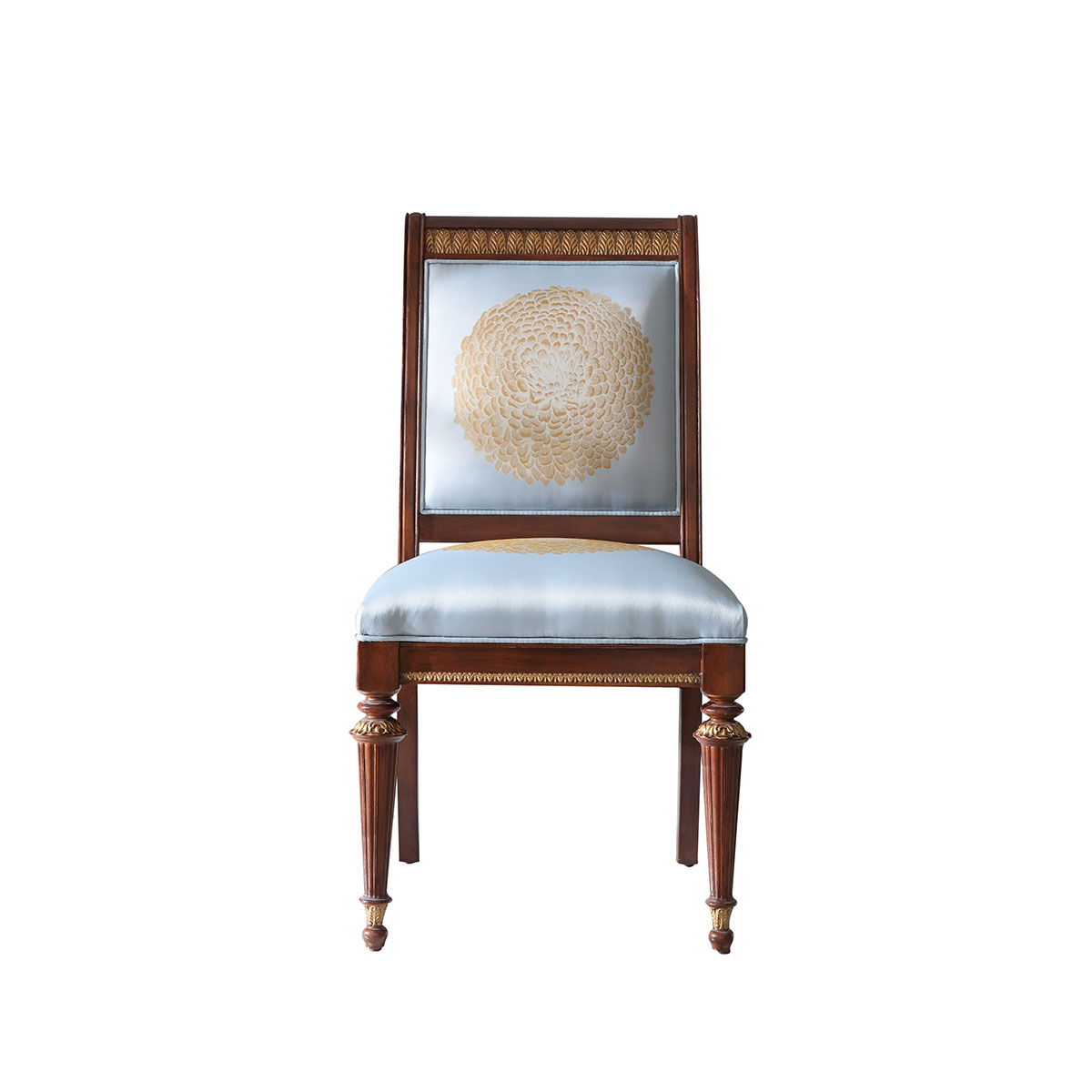 * 以17世紀意大利帝國EMPIRE風格為設(shè)計元素,結(jié)合意大利人重生活懂藝術(shù)的品位追求,使用代表榮譽的月桂葉型雕刻和錐形的腿腳設(shè)計、精致的手工雕刻細節(jié)和描金工藝,以顯示王權(quán)的穩(wěn)固地位;搭配以意大利國花 ——雛菊為意念的金菊圖案,還有布藝和厚實柔軟的填充物,精彩展現(xiàn)了意式家具奢華絢麗而又極富藝術(shù)人文氣息的迷人魅力;