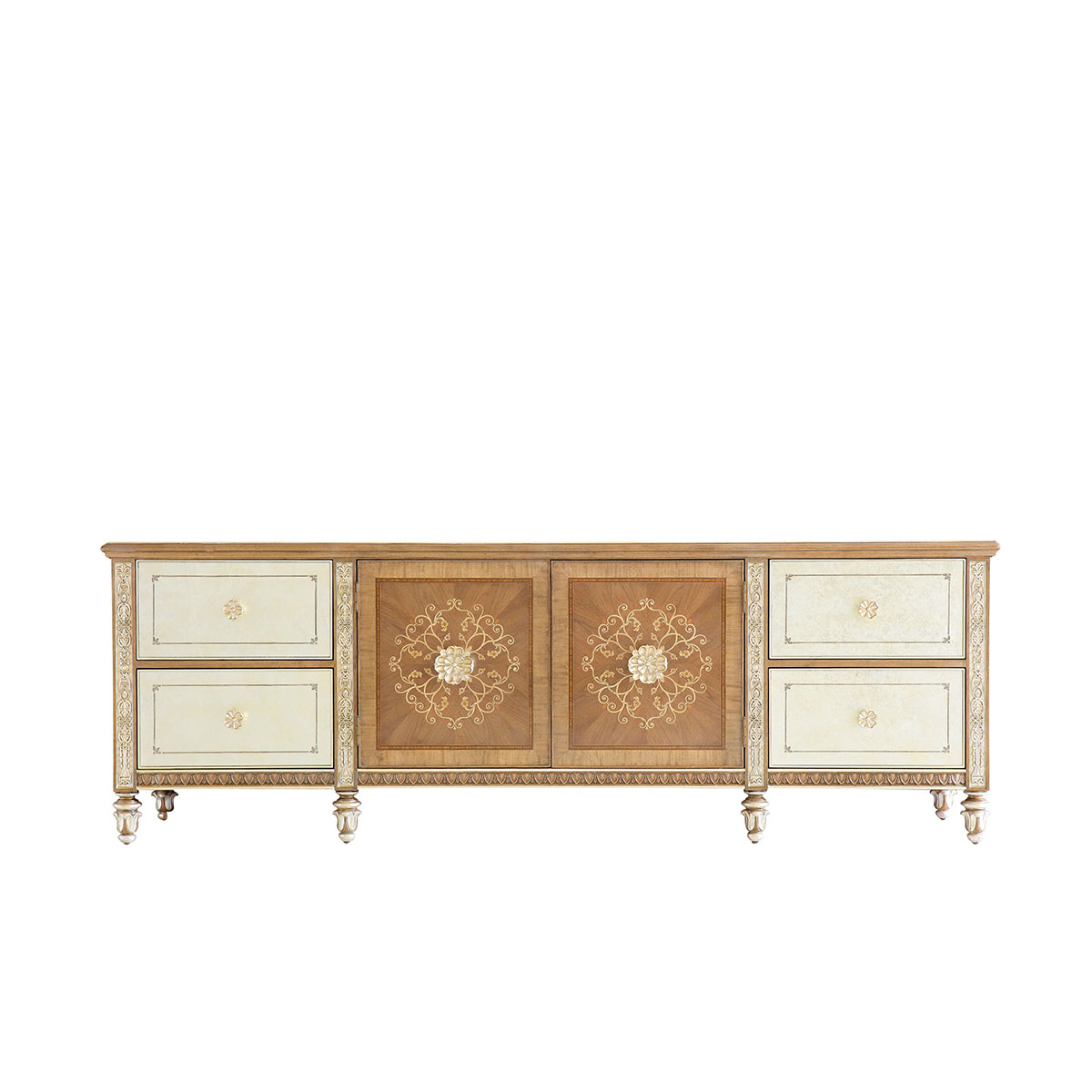 橡膠木+環(huán)保人造板+黑胡桃+艷陽(yáng)花+櫻桃木等木皮貼面+藝術(shù)玻璃