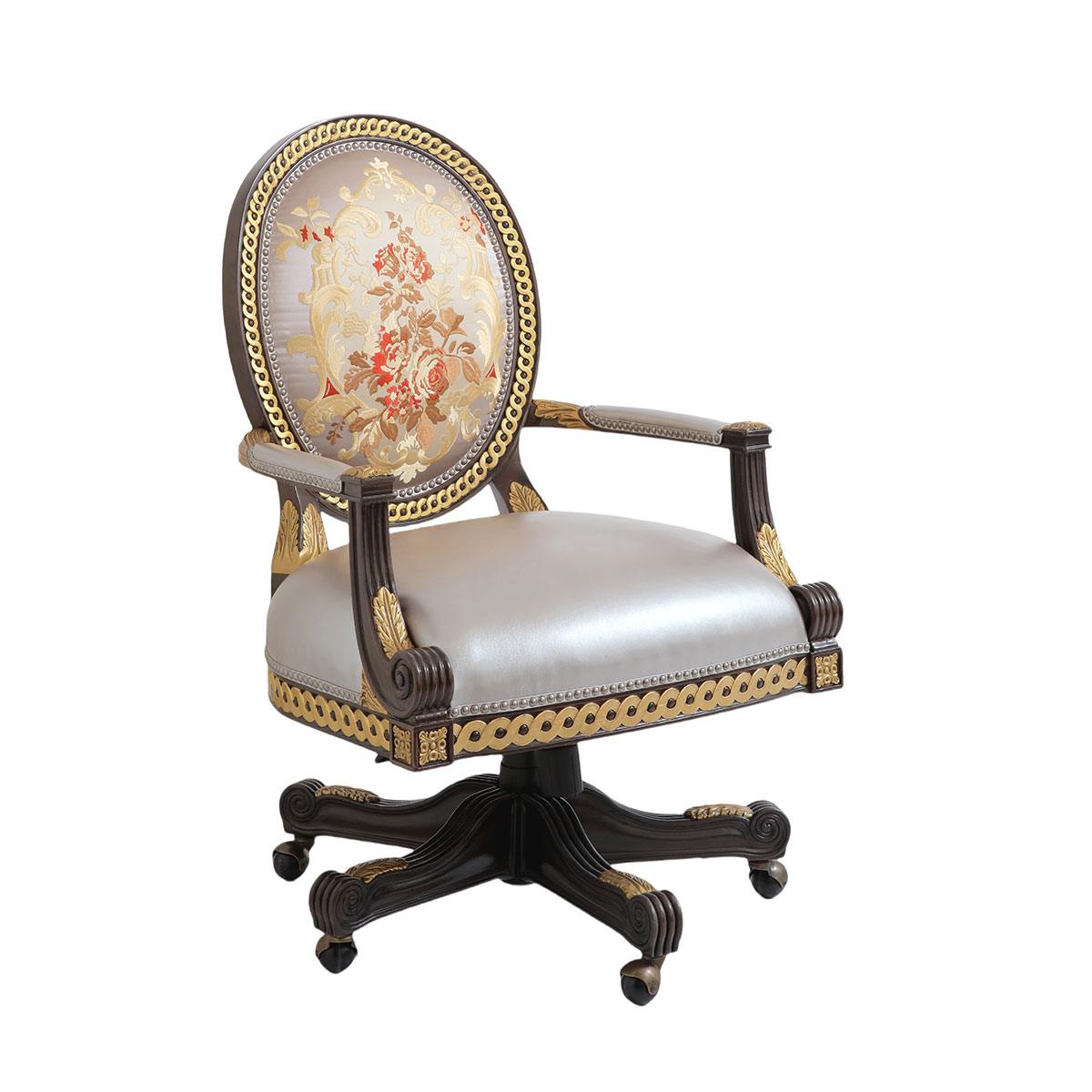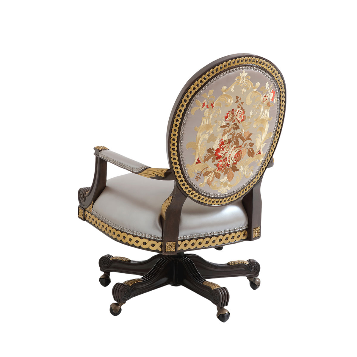 參考18世紀法國路易十六時期涂金扶手椅古董設計,并結合同時期的圓面背板設計。配上精致的連續雕刻和貼金鉑工藝、錐形腳設計、觸感舒適的布藝和包有豐厚的填充物坐墊和靠背。
