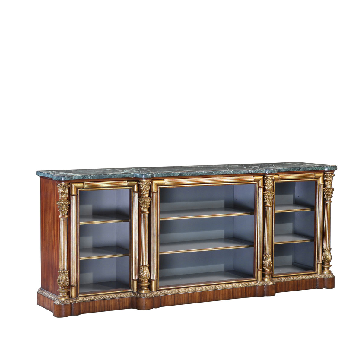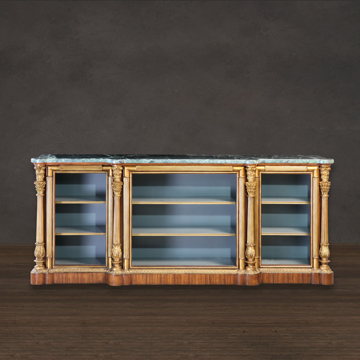 * 這是設(shè)計(jì)意念來(lái)自于英國(guó)溫莎堡中喬治三世時(shí)期的走廊柜。臺(tái)面采用云石做裝飾,借以表達(dá)喬治三世王權(quán)的堅(jiān)不可摧。使用以華麗莊嚴(yán)的 Corinthian Order(科林斯式羅馬柱)為原型的雕刻柱,配上細(xì)膩的木皮貼面和貼金箔工藝,充分展現(xiàn)了英式古董家具的絕世芳華。
