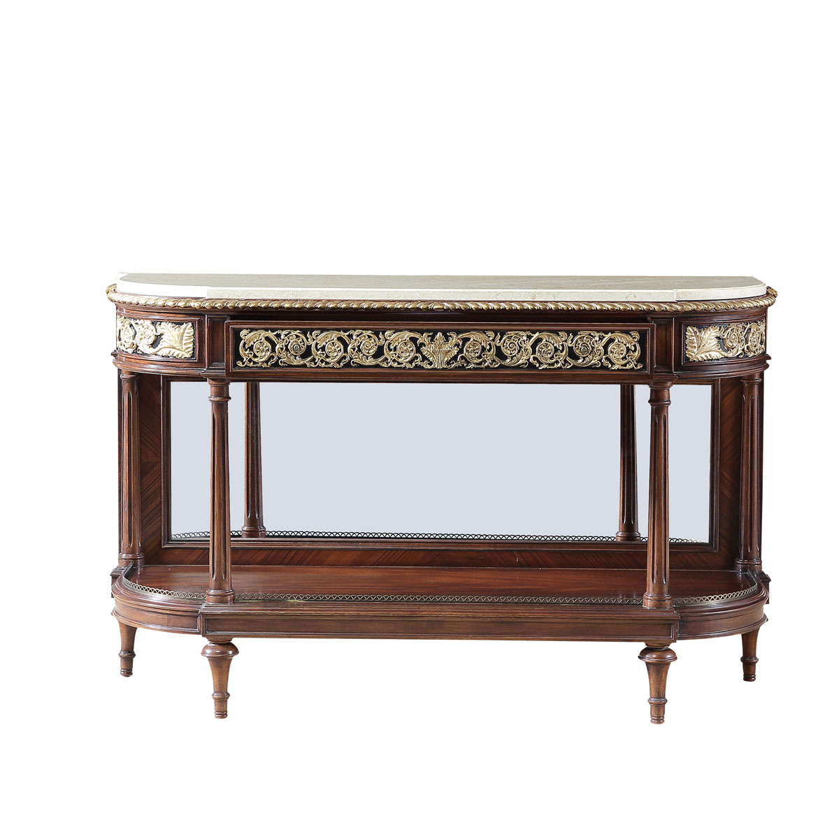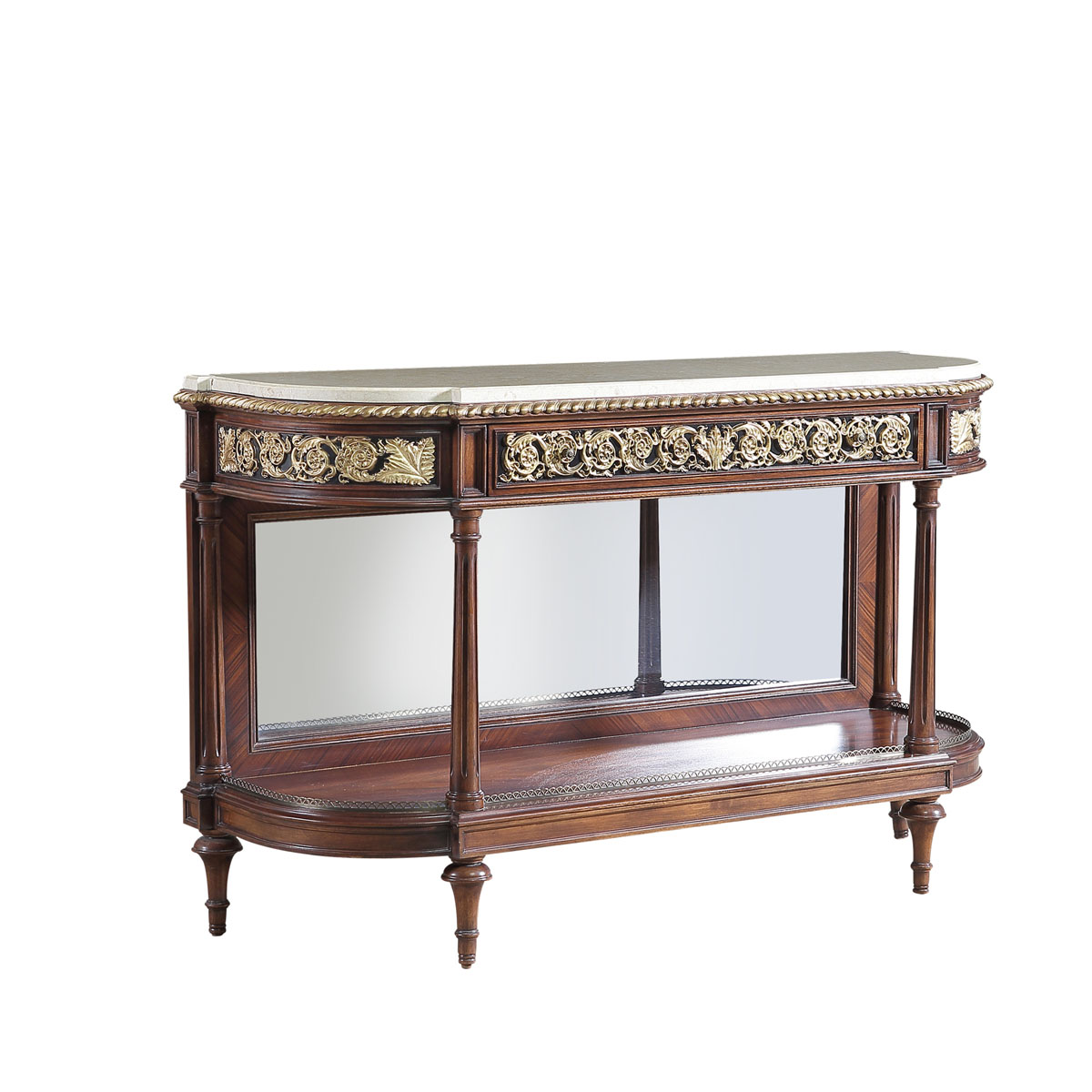 * 這是設計意念來自于英國溫莎堡中喬治三世時期的走廊柜,是18世紀初期新古典主義風格的早期作品,從腿到裝飾花紋都采用了對稱形式,結合帶凹槽的古羅馬柱式設計,讓整件家件透露出古典風格。配上精致的手工雕刻細節和貼金箔工藝,是豪華系列溫莎堡英式走廊桌的特色。