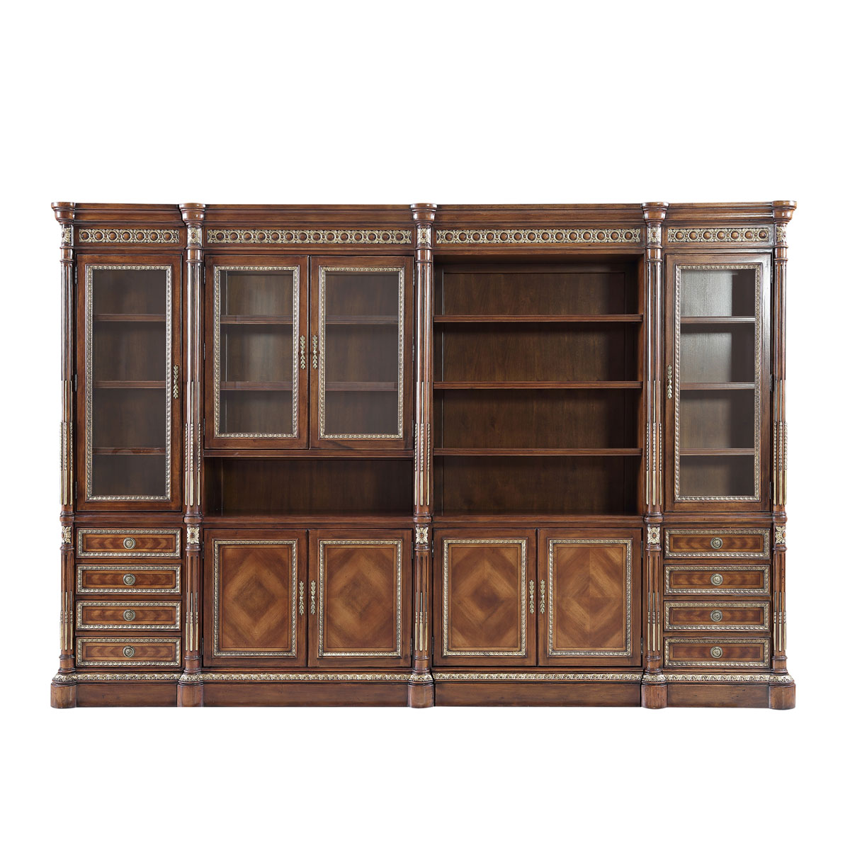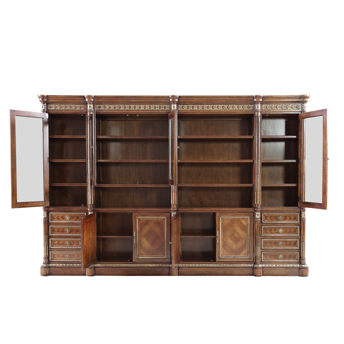 以法國凡爾賽宮為設計元素,表現法國路易時期的莊嚴和浪漫。多隔層大容量的合理設計,功能完善的組合書柜,是蘊藏知識和靈感的空間,木皮拼花紋理增添藝術韻味,是家中的“博物館”,讓我們與外界的關系更密切,帶玻璃門設計既美觀又能起到防塵防污效果。