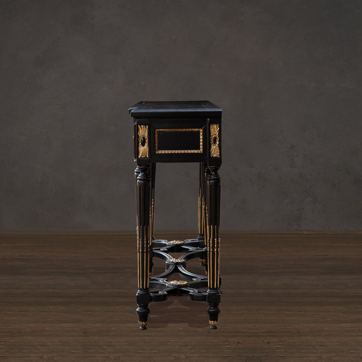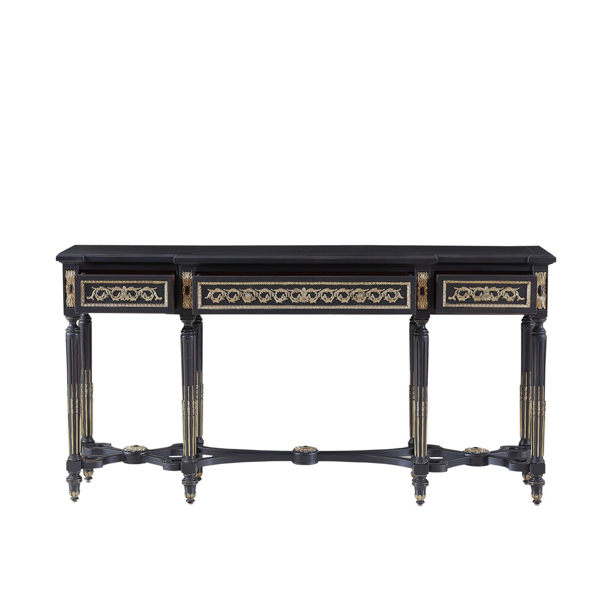 * 為表現法國路易時期的莊嚴和浪漫,以法國凡爾賽宮為設計元素。使用歌頌路易十四時期的太陽花連環雕刻,顯示其王權穩固地位的錐形腿腳設計;配以哥特式建筑中的大圓窗骨架設計、精美的木皮貼面與絢麗的貼金工藝,完美演繹了法式宮廷家具的奢華尊貴。