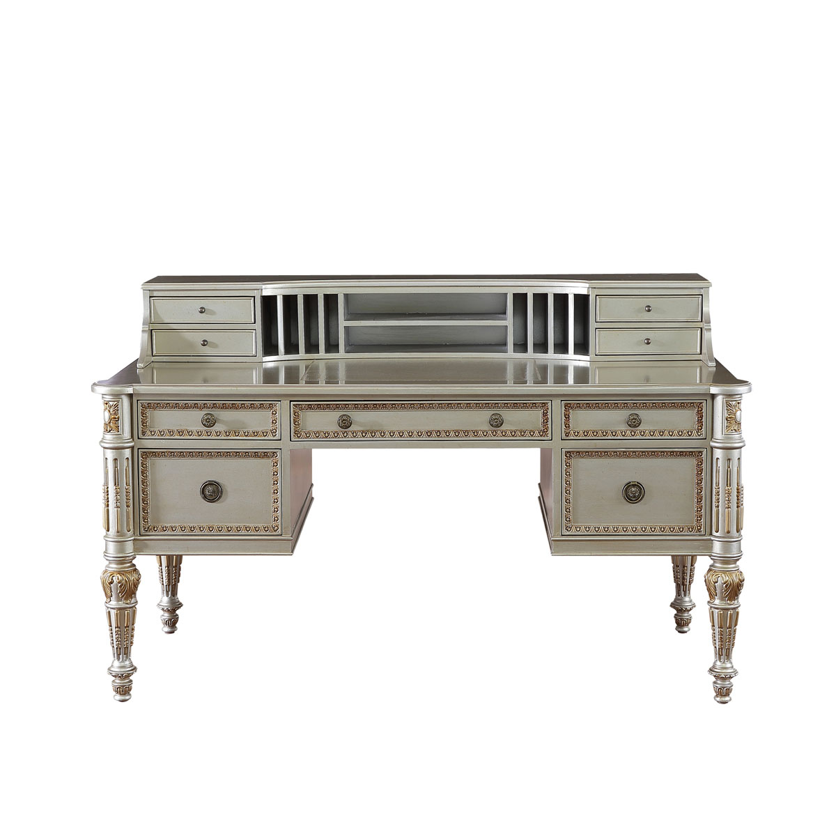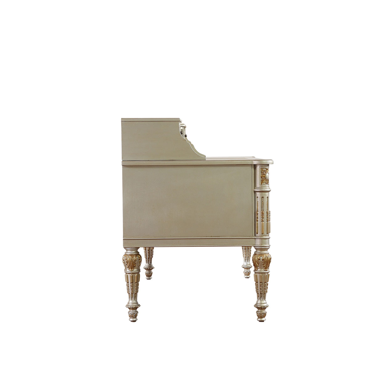 * 女主人關于美的秘密,或許只有梳妝臺知道。卷葉植物與直線凹槽裝飾的錐形腳,象征著皇室的卓越品味;華麗金箔貼飾和鉆石形拼花圖案,傳遞出奢華浪漫的專屬風格;而豐富的小抽屜與層格設計,則用實用功能向玲瑯滿目的化妝品與珍寶首飾致敬.