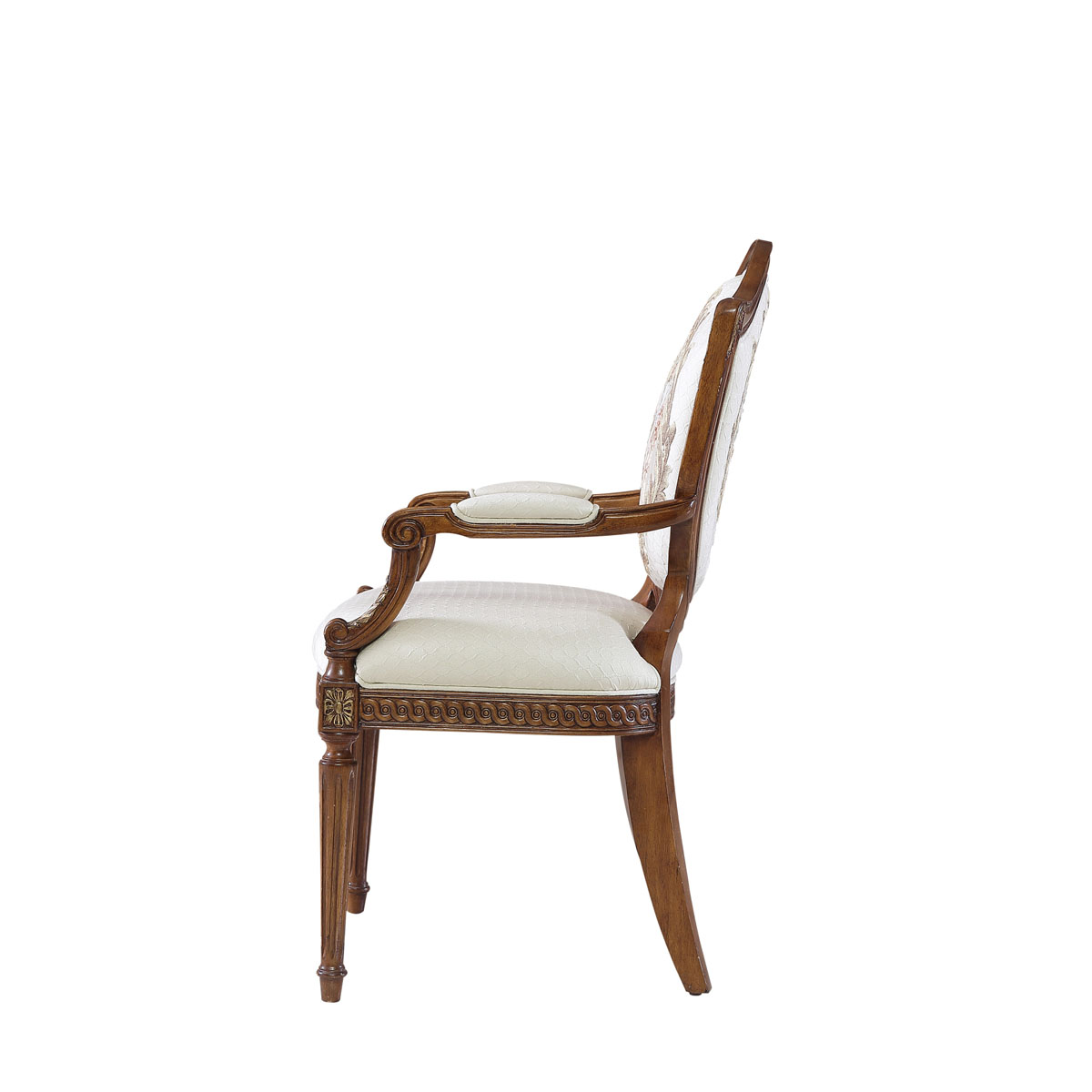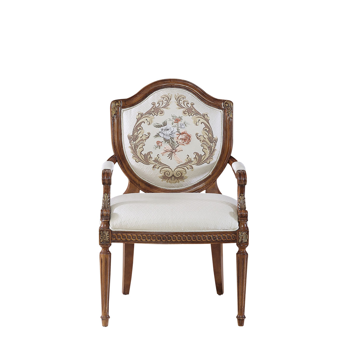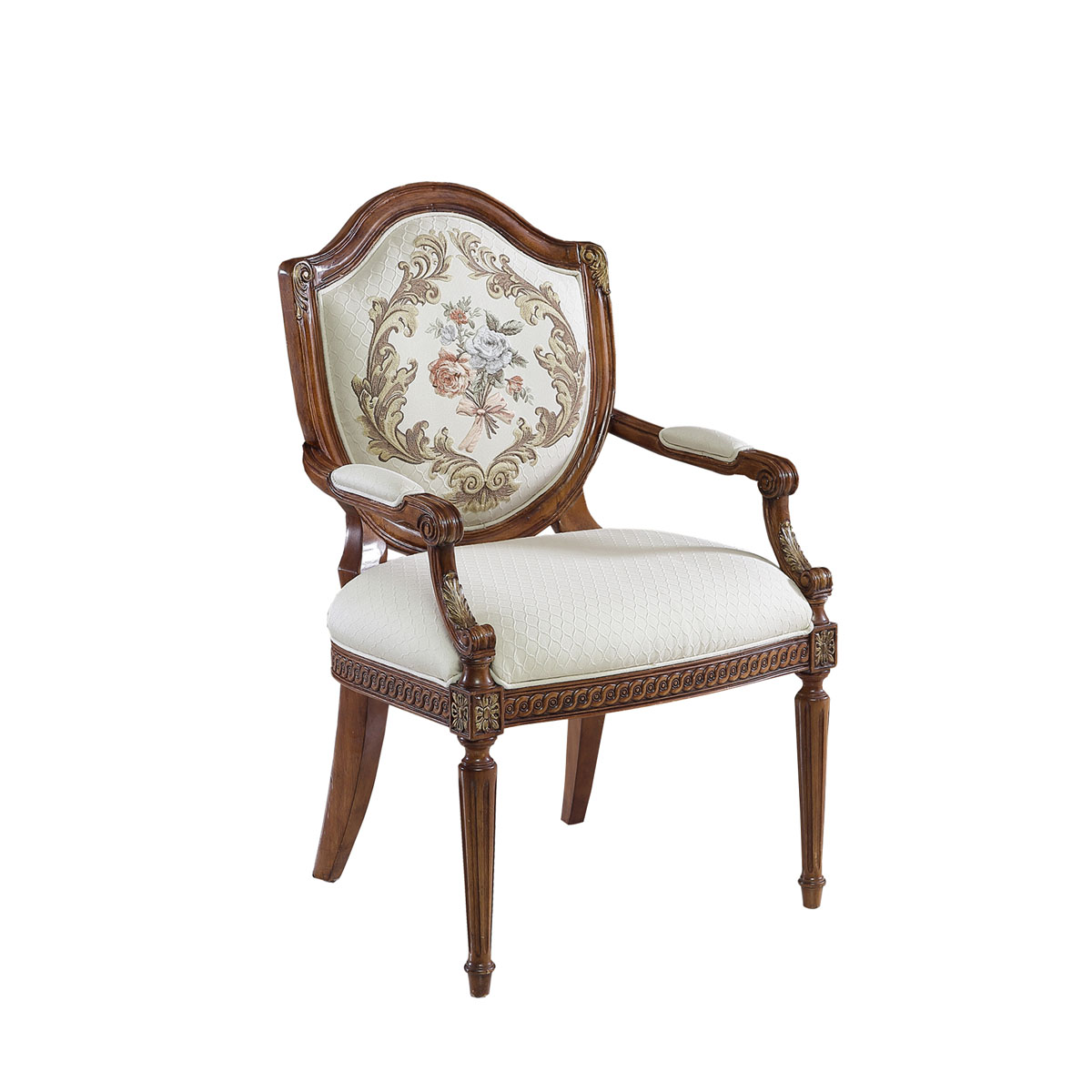 法國新古典和洛可可風格,盾型椅背造型簡約大方,建筑柱雕刻柱腿簡約的直線條造型,端莊大氣,采用印花布藝,非常有田園風的感覺。