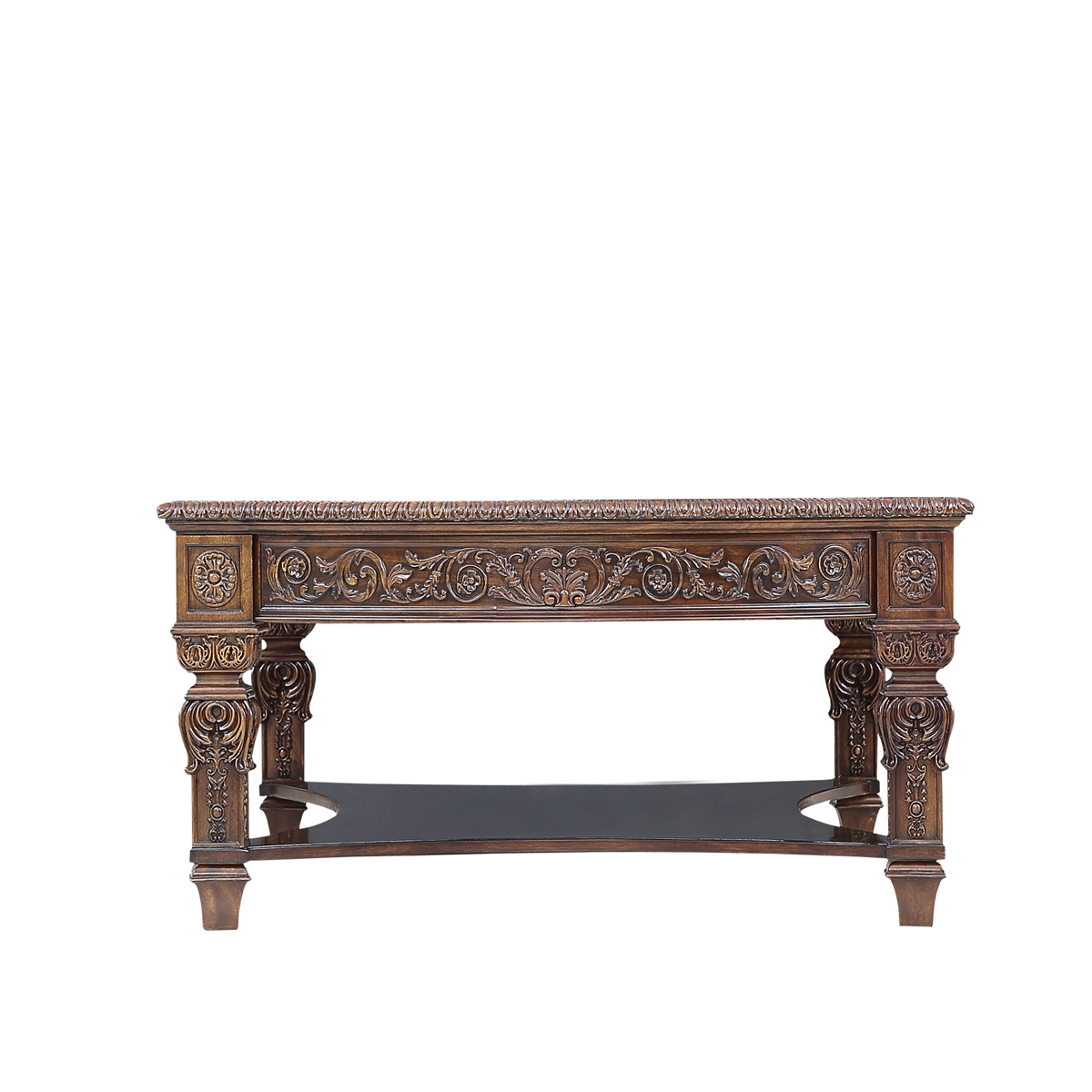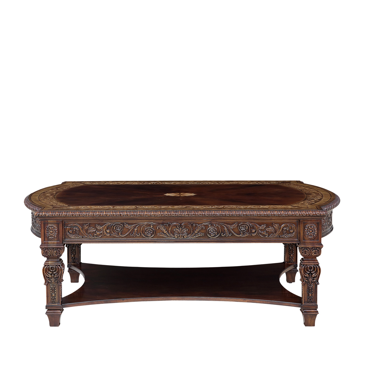 * 以現位于美國白宮中象征友誼和權力的堅毅桌(英語:Resolute desk)為設計意念, 以實木拼貼和雕刻工藝,將具有紀念意義的歷史時刻融入其中,實用性的功能設計更是把藝術和生活完美結合, 是宮廷系列華盛頓美式咖啡臺的特色。(注:咖啡桌前方有兩個儲物抽斗)