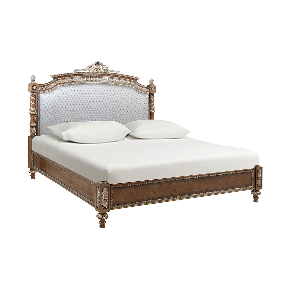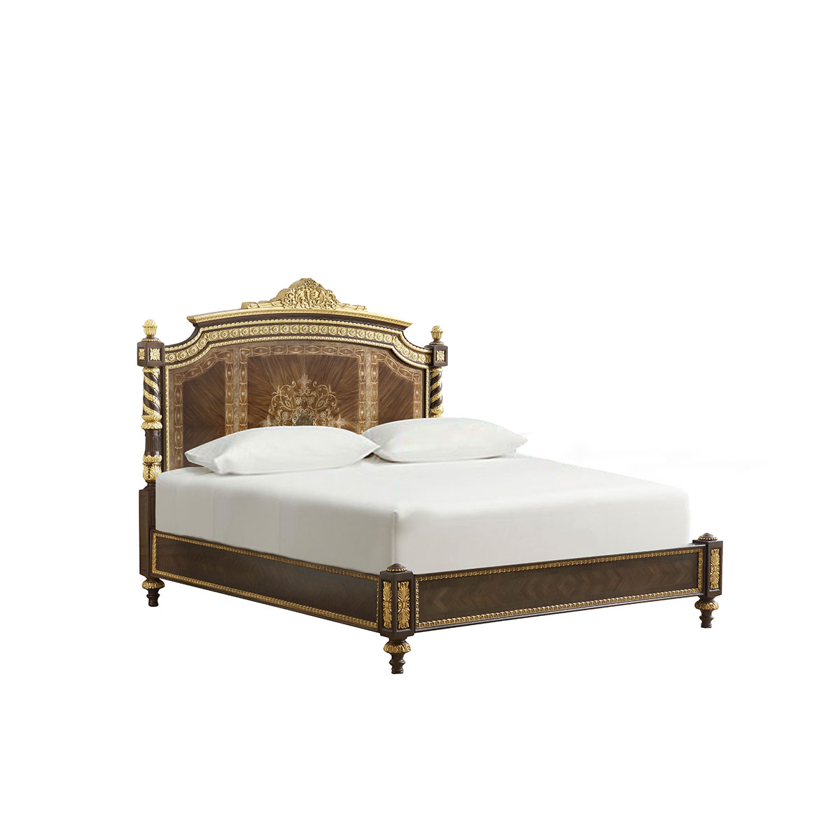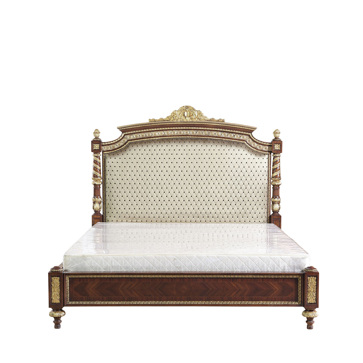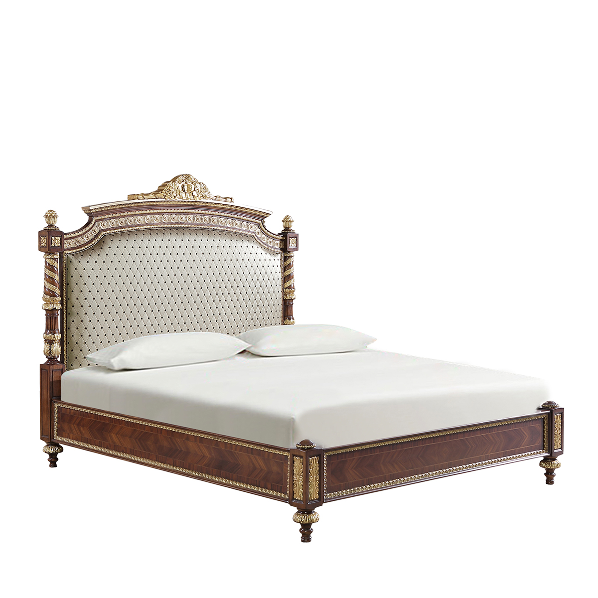 * 以英國溫莎城堡中喬治四世時期的臥床為設計意念,使用皇家御用的桃花心木為主要材質,配以精致的雕刻和貼金工藝,表達英國皇室尊貴的地位;同時使用舒適的軟包和柔順的布藝,使藝術和生活結合,表達英國君王臥床應有的品質,是溫莎堡系列英式軟包床的特色;