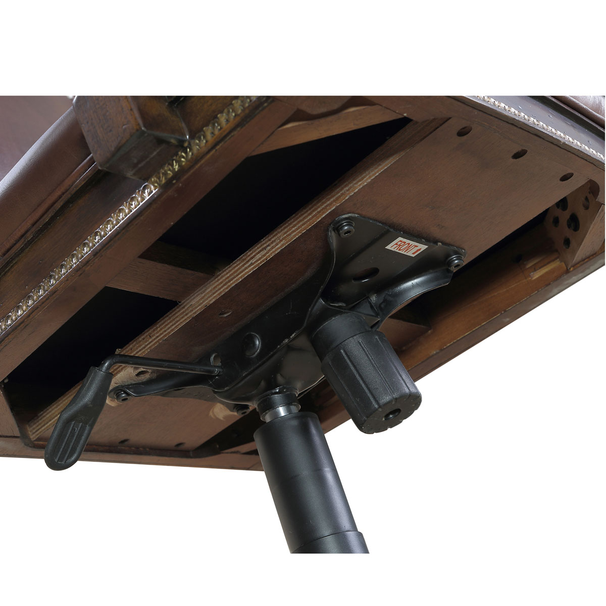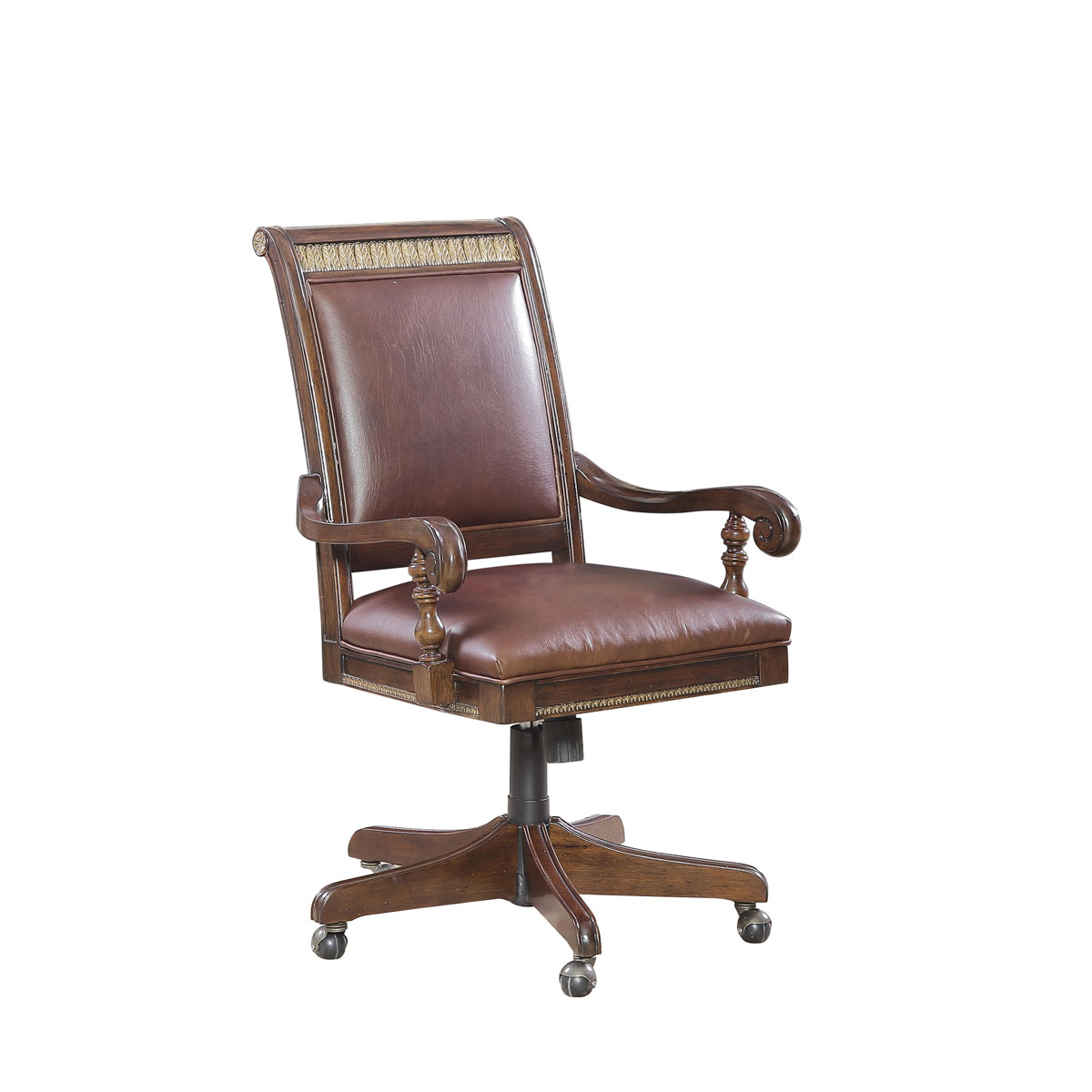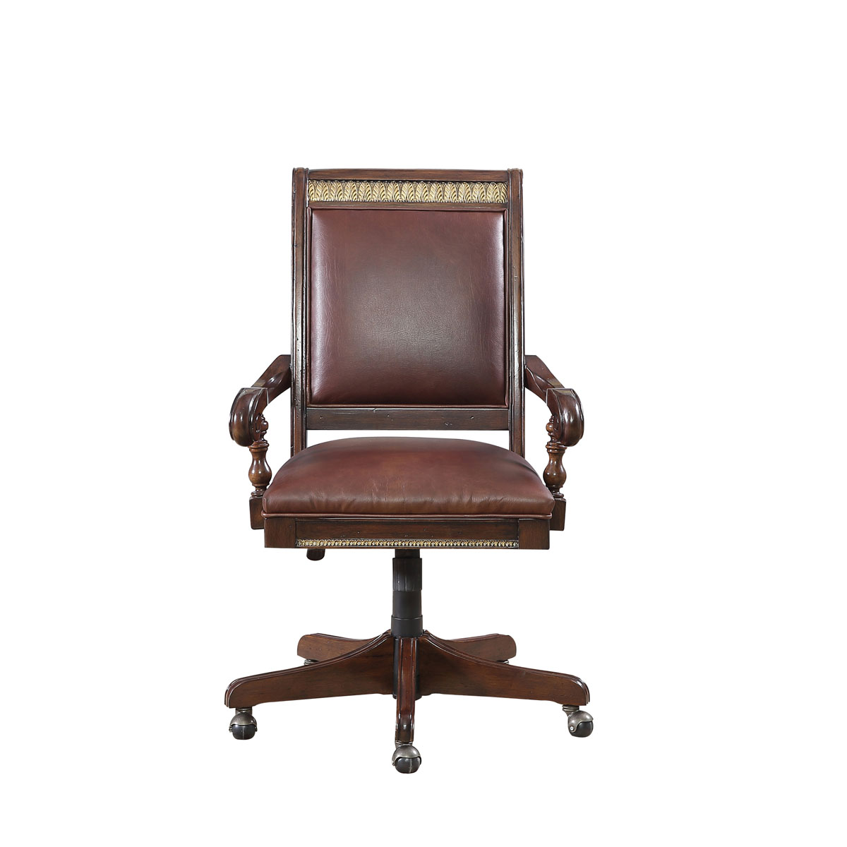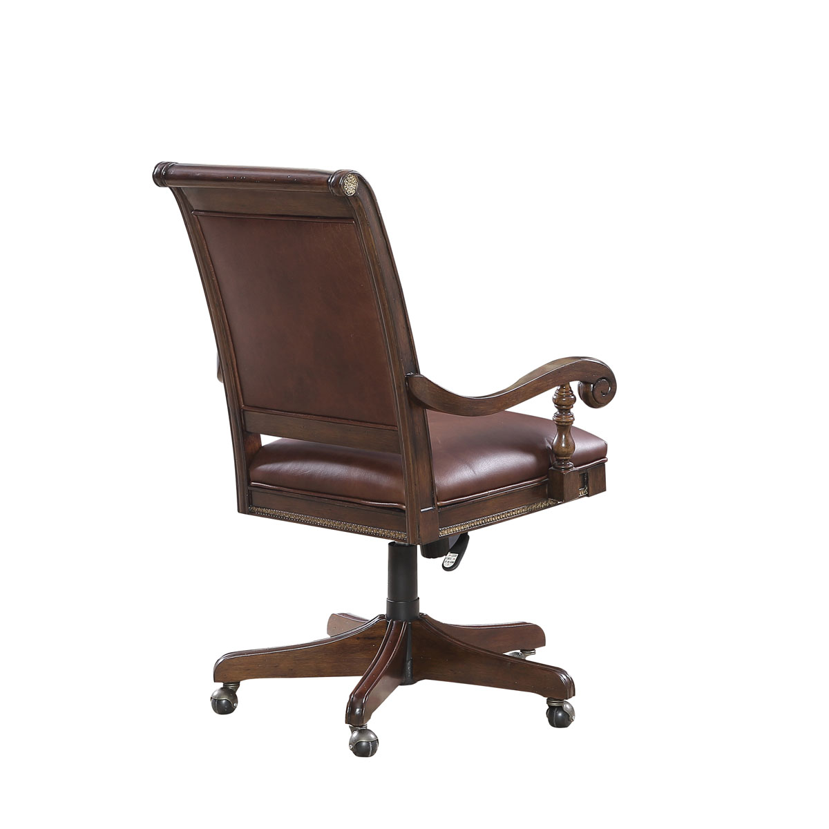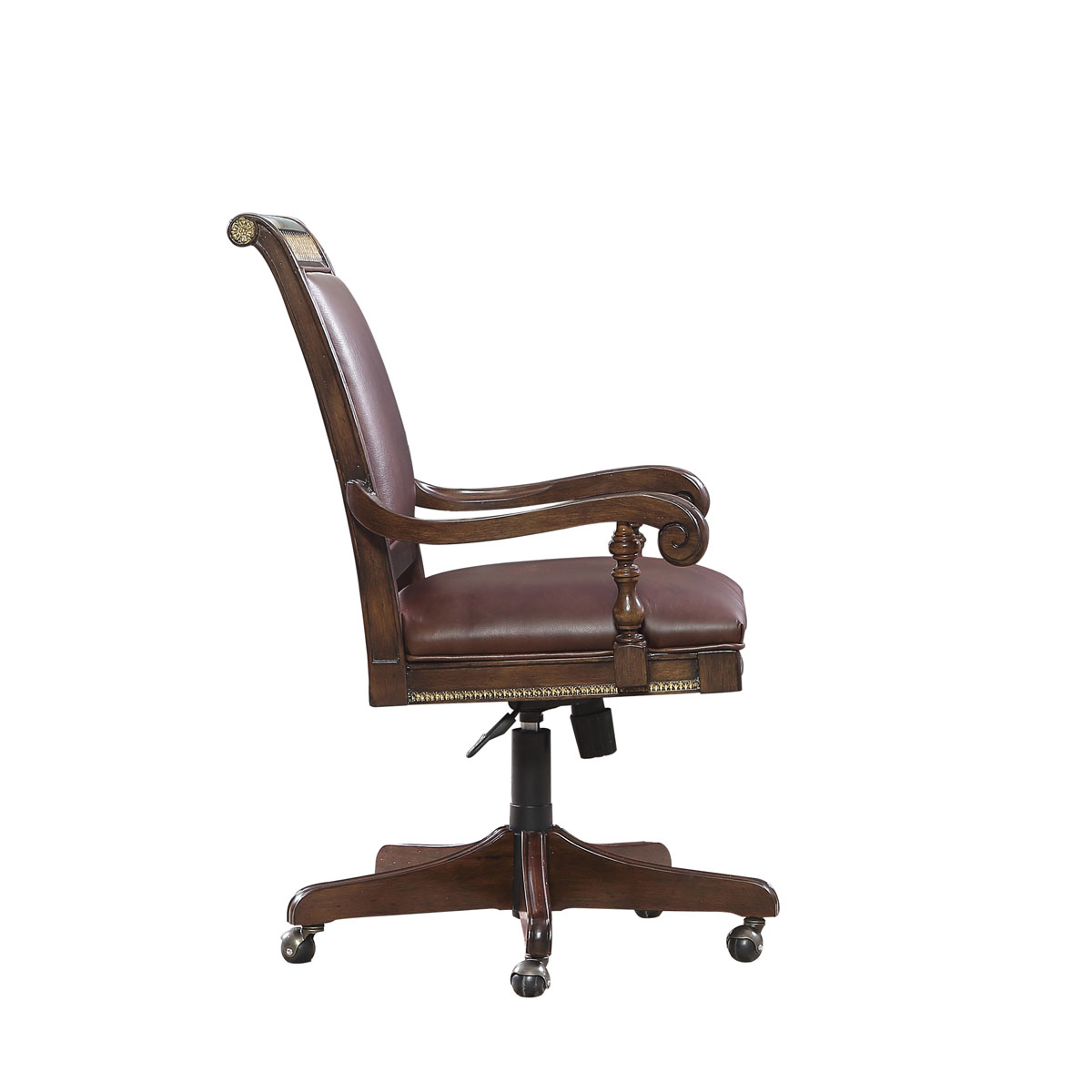 翡冷翠辦公椅細(xì)膩的葡萄葉雕刻飾以描金工藝,是從意大利傳承千年的葡萄酒文化中汲取的設(shè)計靈感;旋渦狀的羊角扶手結(jié)合可調(diào)節(jié)高度的皮藝坐墊和360度旋轉(zhuǎn)順暢的腳輪,無疑為良好的辦公環(huán)境加持。