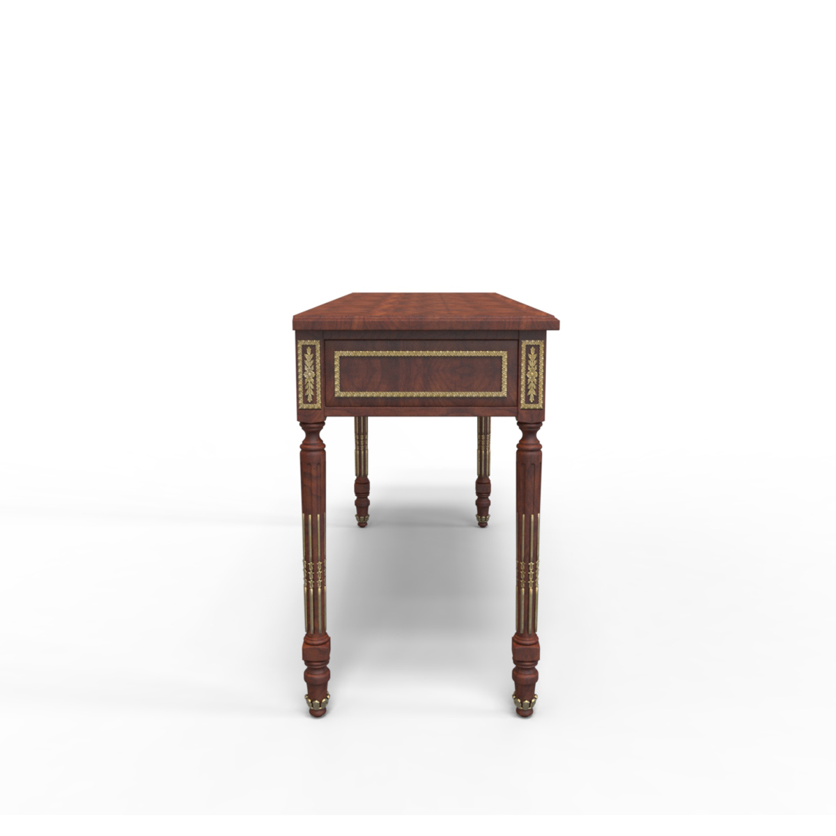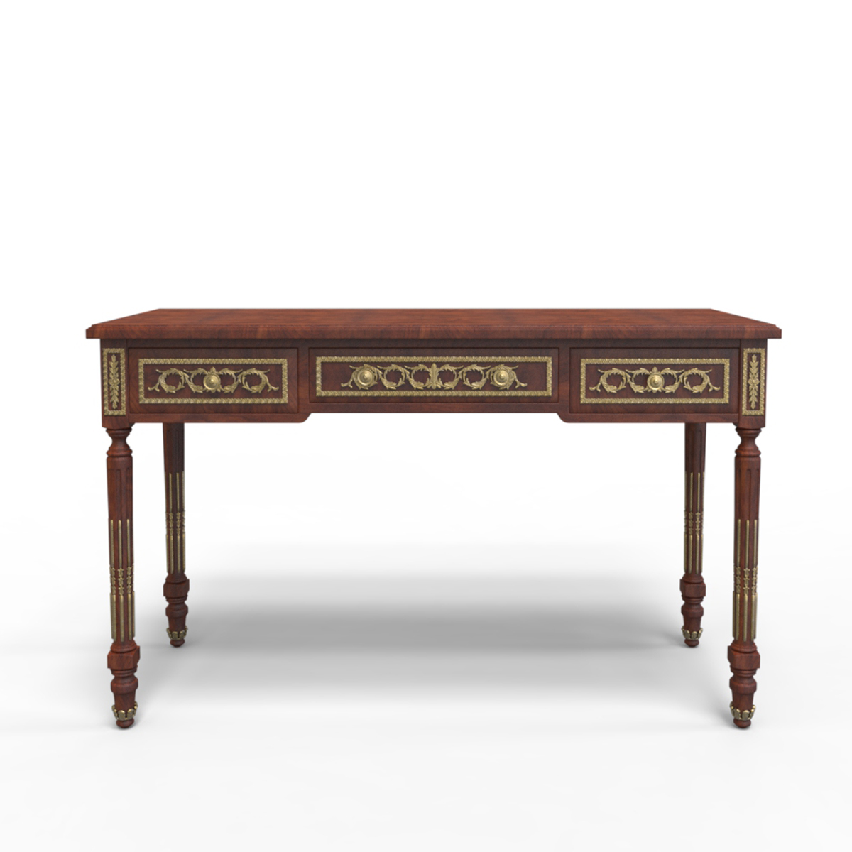 * 為表現(xiàn)法國(guó)路易時(shí)期的莊嚴(yán)和浪漫,以法國(guó)凡爾賽宮為設(shè)計(jì)元素。使用歌頌路易十四時(shí)期的太陽(yáng)花雕刻;路易十六時(shí)期的建筑柱雕刻;顯示其王權(quán)穩(wěn)固地位的錐形腿腳設(shè)計(jì)、古銅色的球形把手和貼金工藝,完美演繹了法式宮廷家具的奢華尊貴。