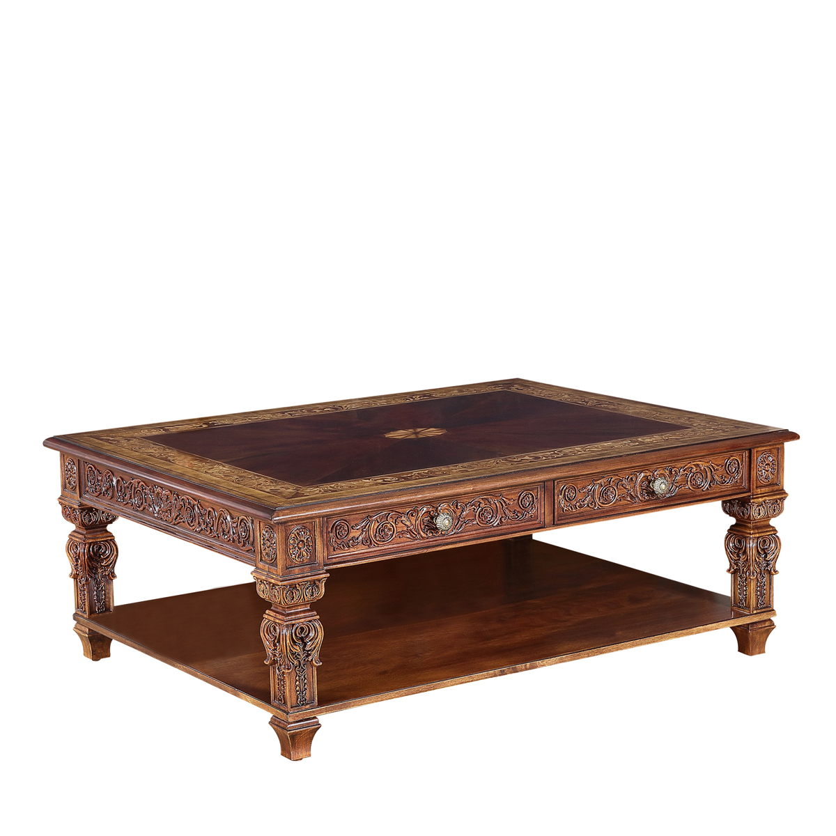 * 手工雕刻的工藝細節; * 結實的連接技術; * 四個儲物抽斗,而在其底部采用經典硬木實木滑軌設計; * 底部為開空設計,方便存取物品;