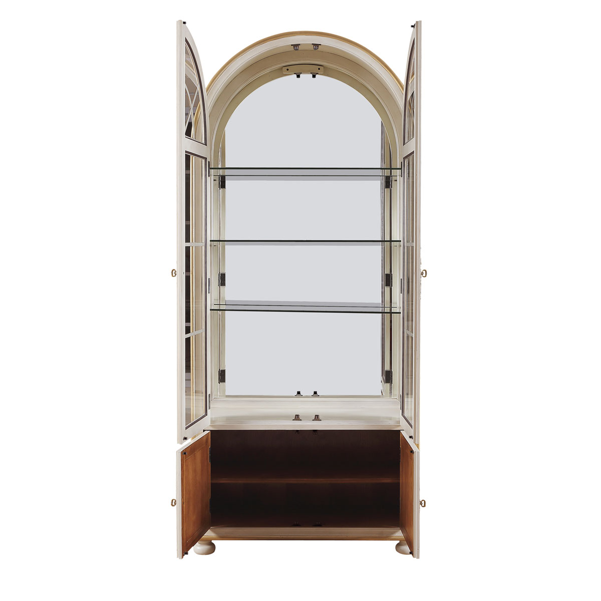 * 門內有三塊玻璃層板,背板處裝有背鏡,使柜身內部的光線更通亮; * 下門內有一塊可調木制層板;