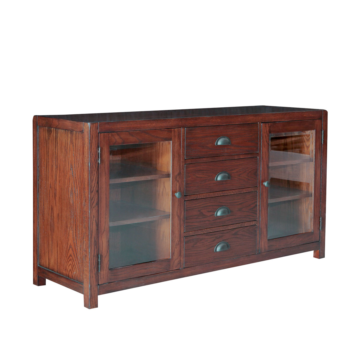 * 四個儲物抽斗,采用硬木實木滑軌設計; * 兩邊實木框玻璃門,各帶兩塊木制活動層板 * 腳底部裝有可調整的腳釘;