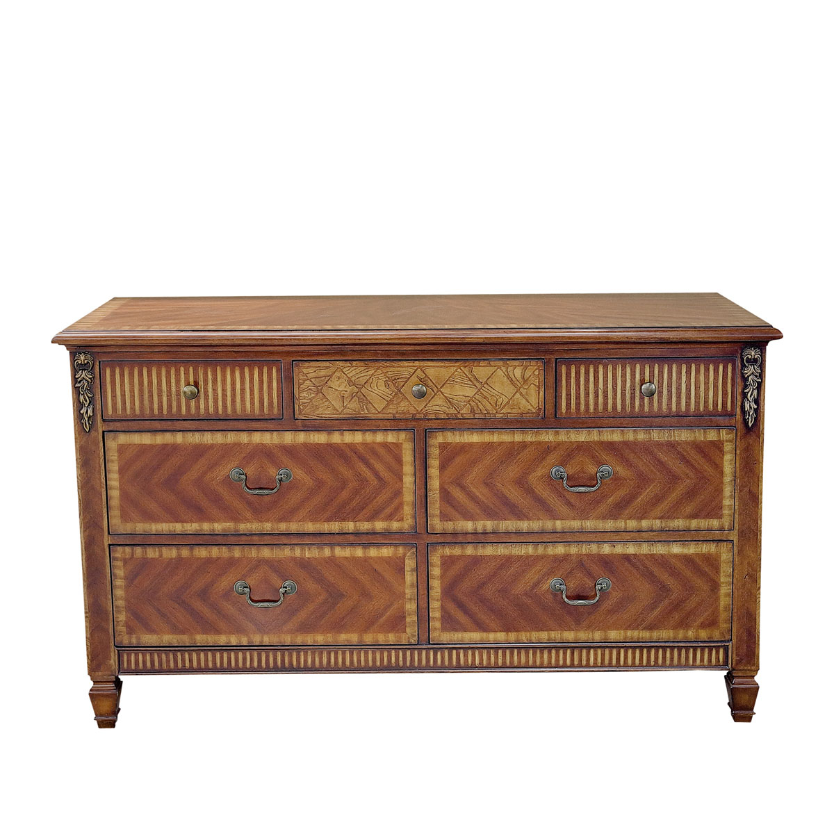 * 手工木皮拼貼工藝 * 七個儲物抽斗,上面中間抽斗可翻下抽斗面(兩側(cè)裝有消聲鐵滑軌),可放DVD電器,背板有通線孔; * 腳底部裝有可調(diào)腳釘;