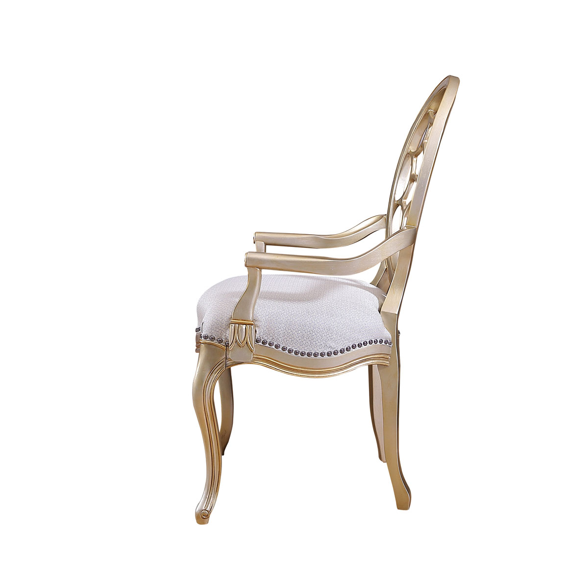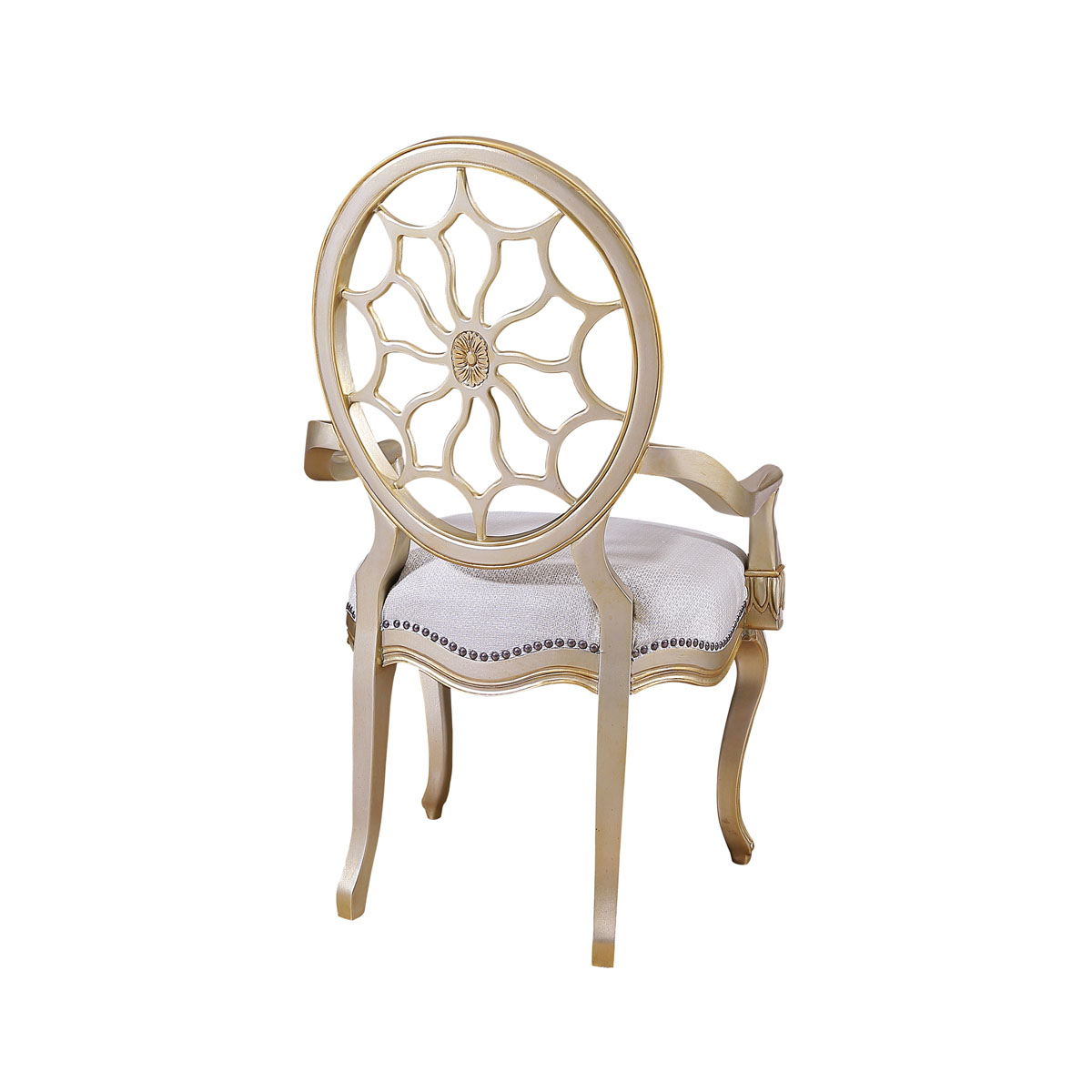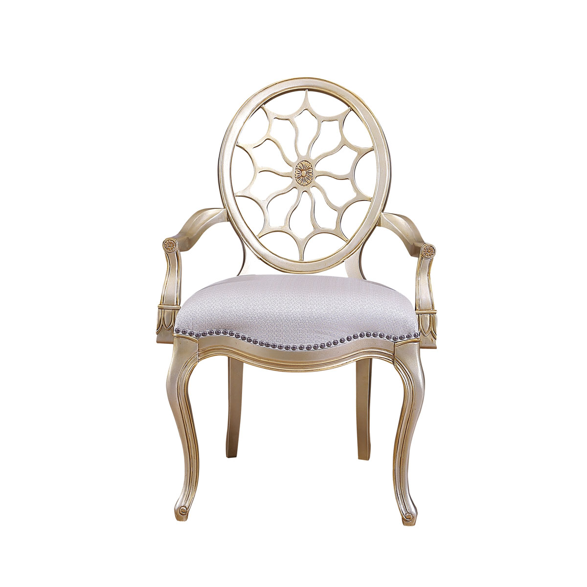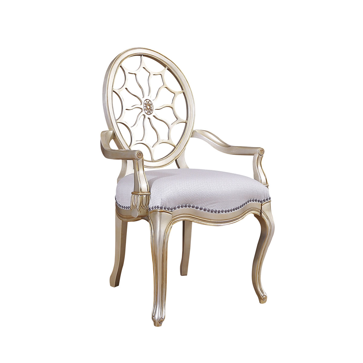 * 參考喬治三世時期的古董造型設計,使用輪子構造椅背和安妮王后腿,配以精致的手工雕刻細節和涂金工藝、布藝面料和厚實柔軟的填充物,是豪華系列凡爾賽玫瑰法式扶手椅的特色。