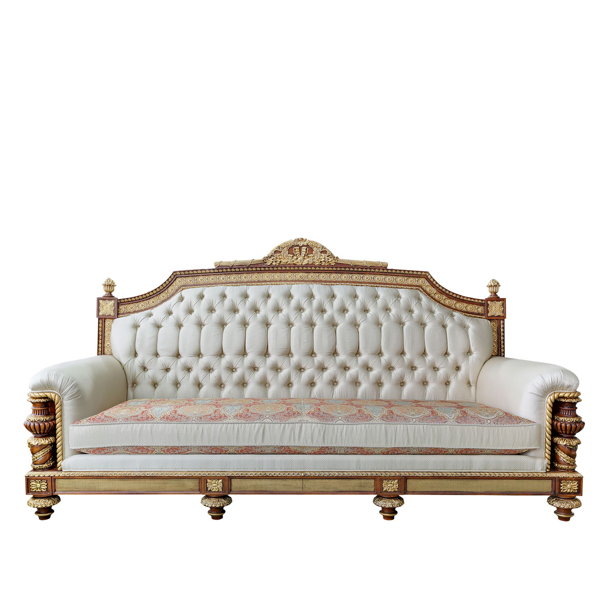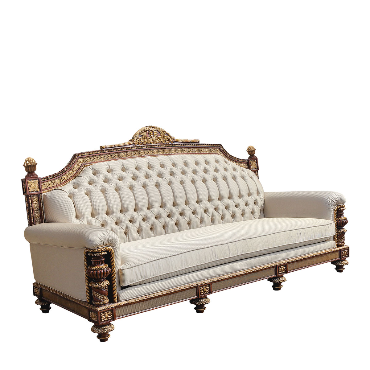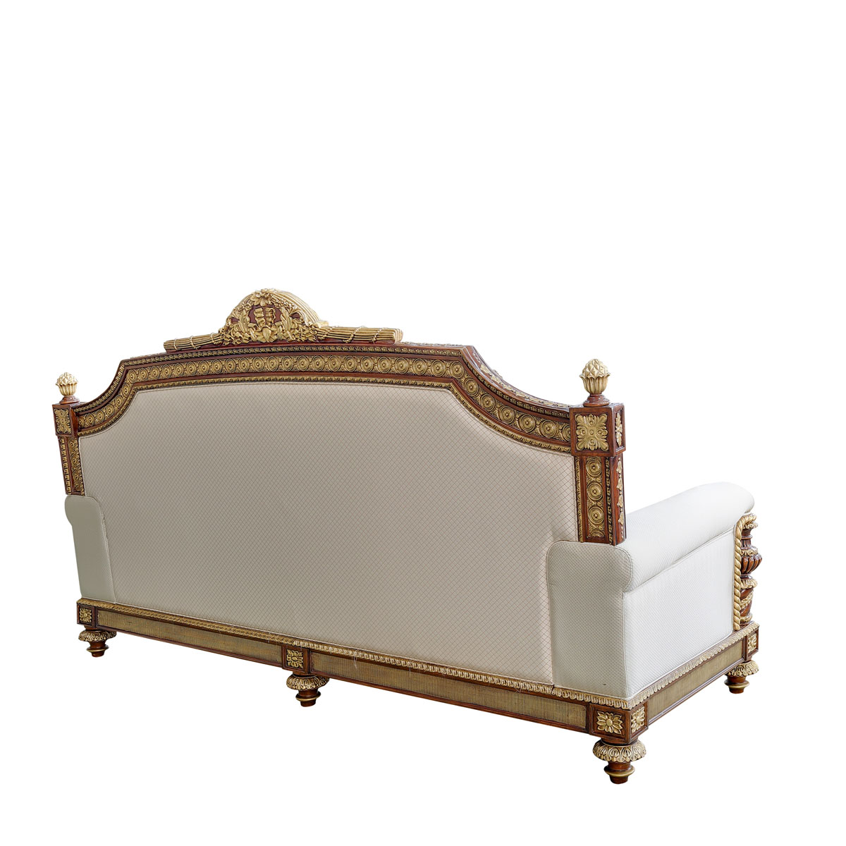 * 以英國溫莎城堡中喬治四世時期的臥床為設計意念,使用皇家御用的桃花心木為主要材質,配以精致的雕刻和貼金工藝,表達英國皇室尊貴的地位。同時使用舒適的軟包和柔順的布藝,使藝術和生活結合,表達英國君王客廳應有的品質,是溫莎堡系列英式沙發的特色。