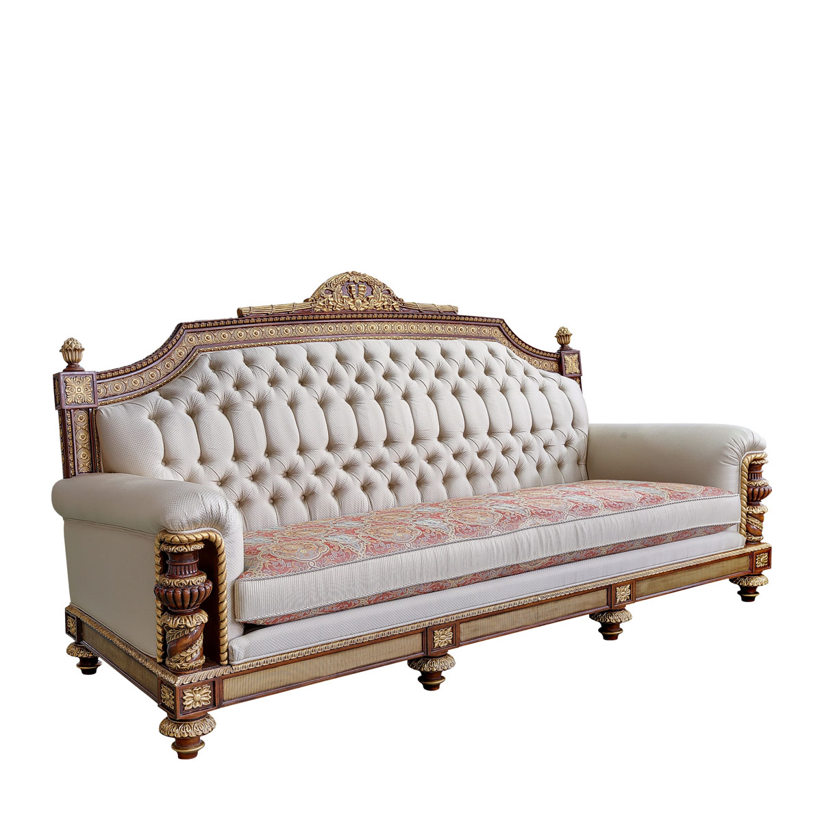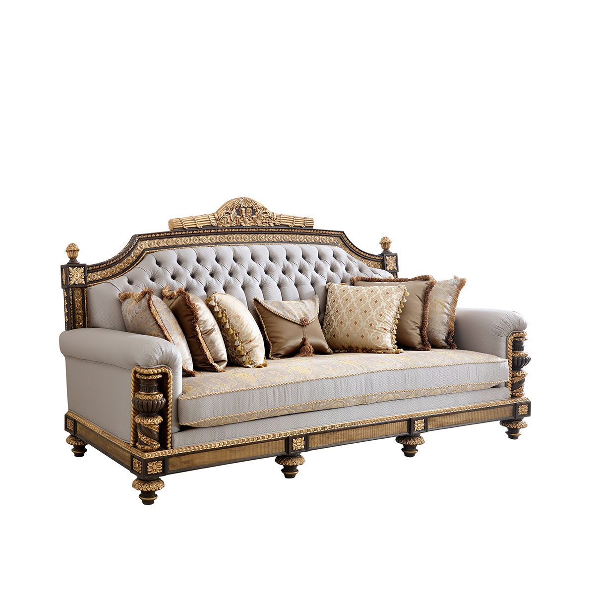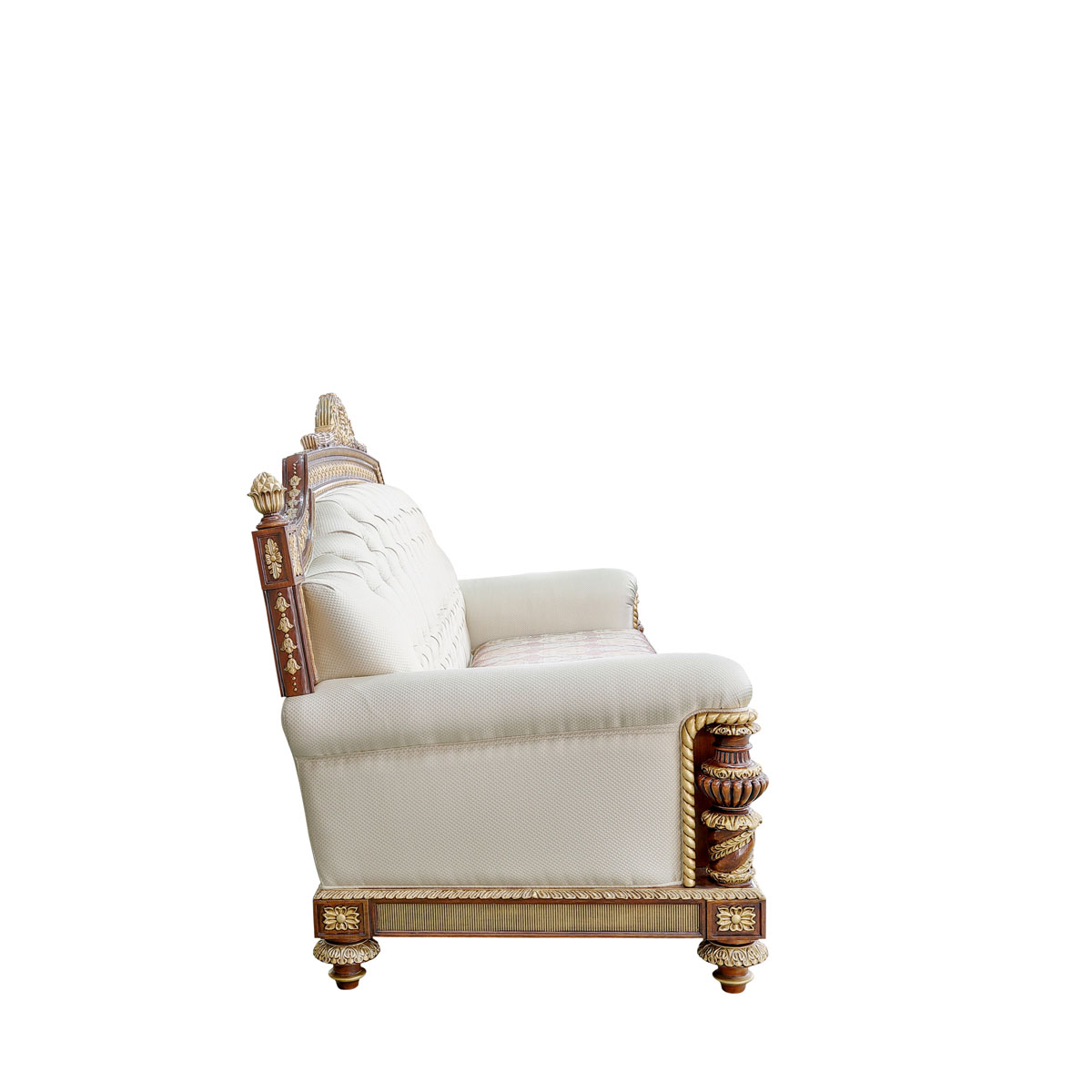 * 以英國溫莎城堡中喬治四世時期的臥床為設計意念,使用皇家御用的桃花心木為主要材質,配以精致的雕刻和貼金工藝,表達英國皇室尊貴的地位。同時使用舒適的軟包和柔順的布藝,使藝術和生活結合,表達英國君王客廳應有的品質,是溫莎堡系列英式沙發的特色。
