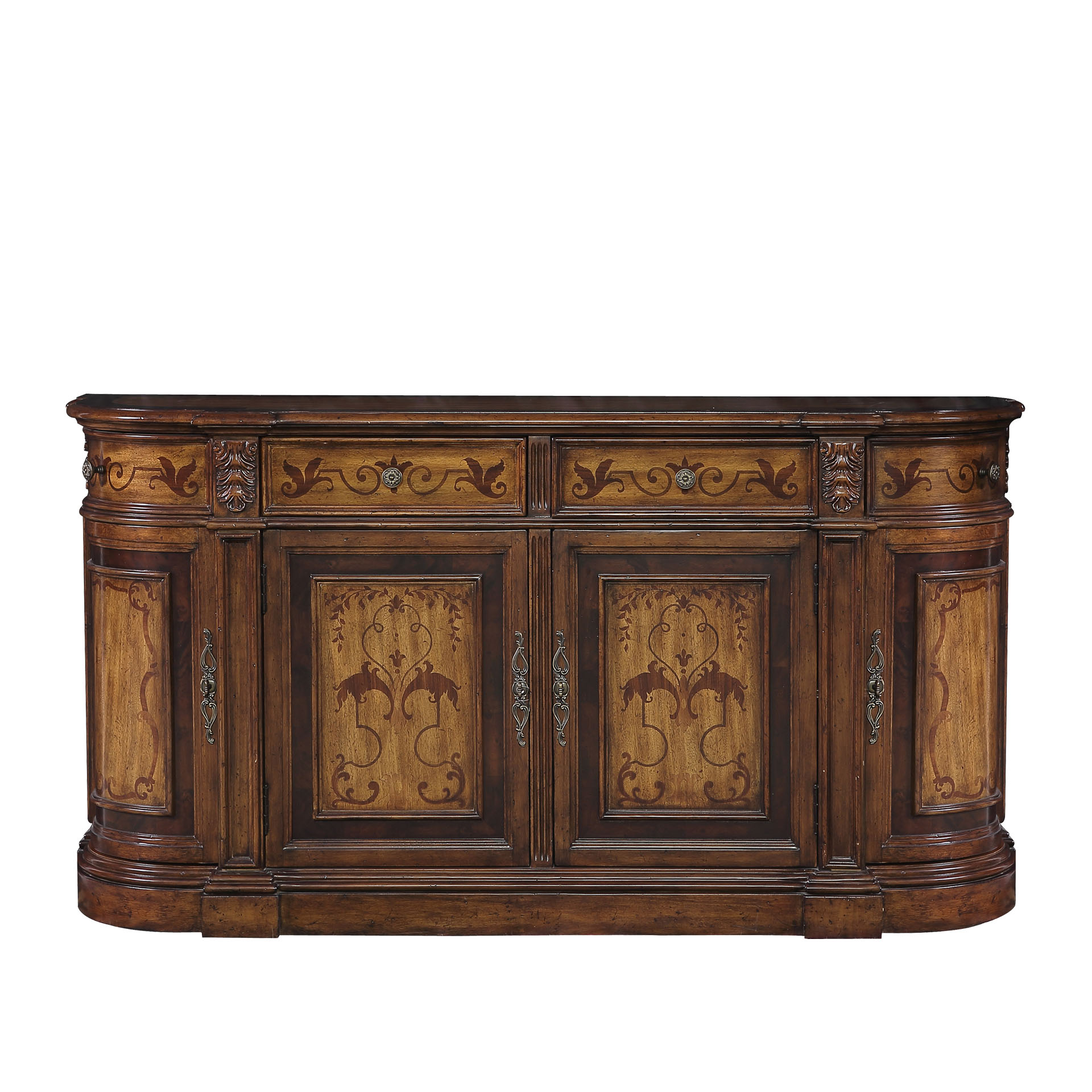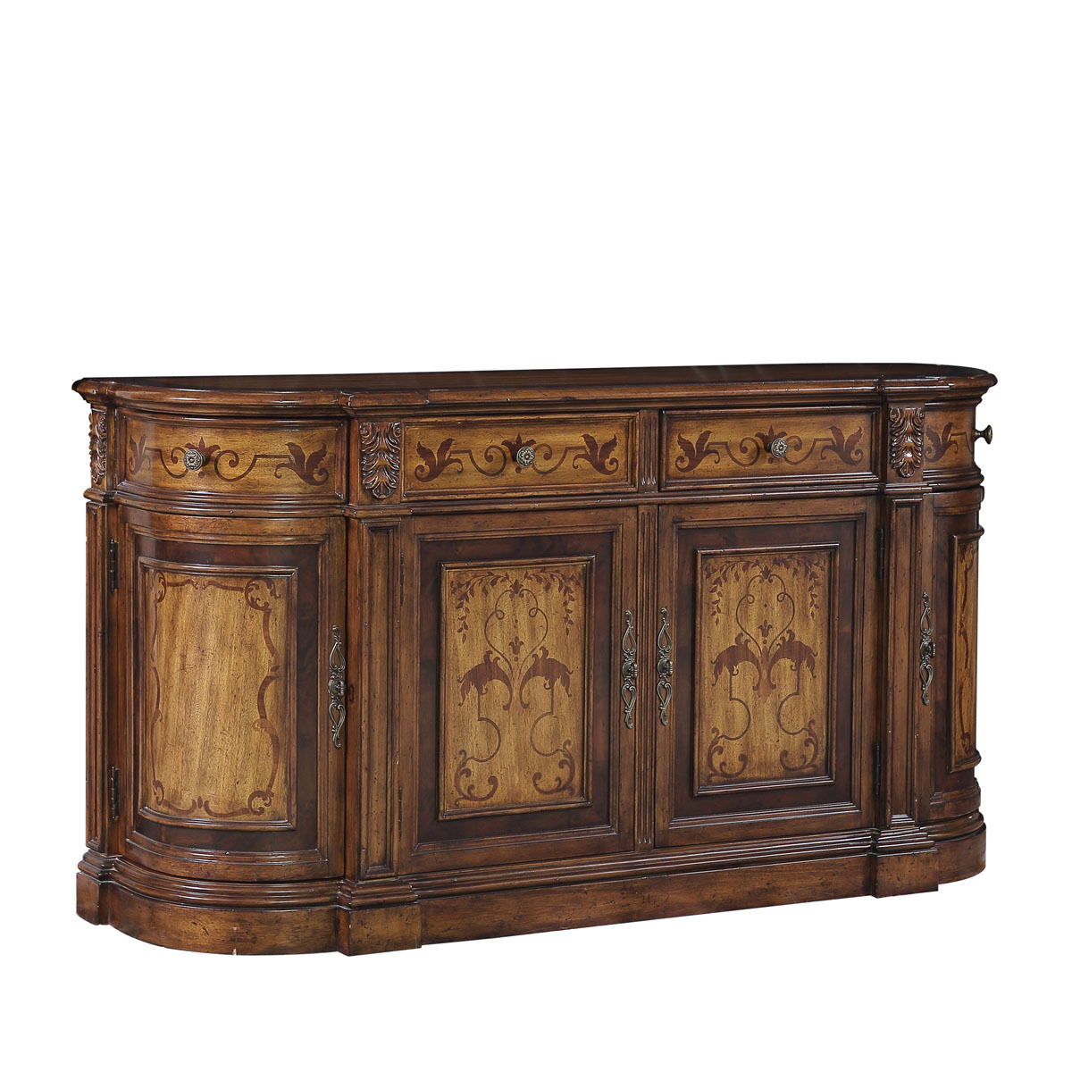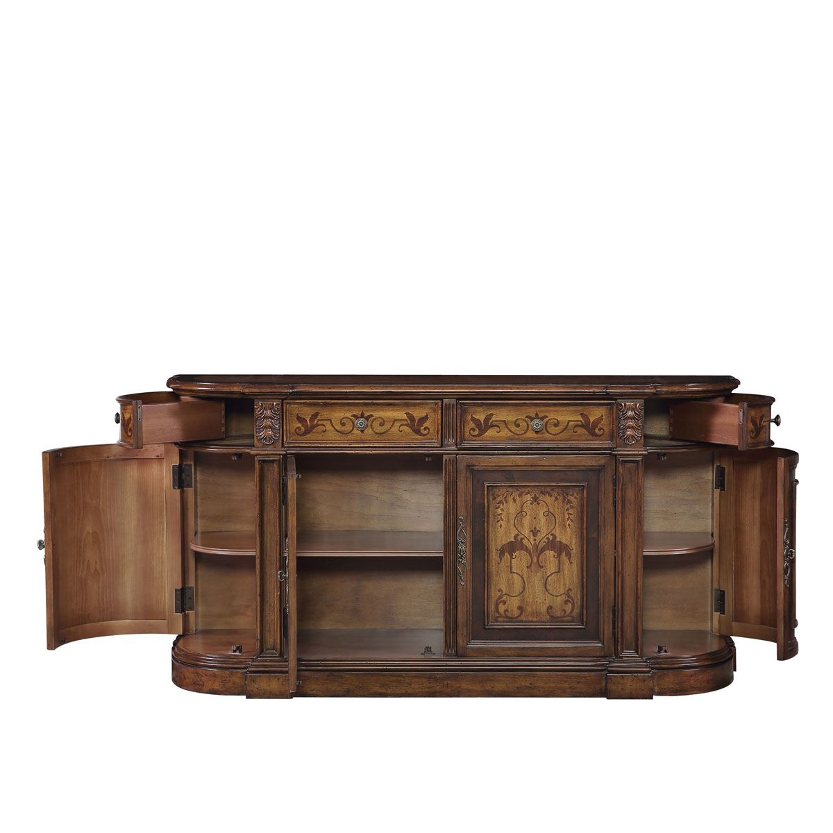 * 這款碗柜是典型的巴洛克風格家具,頂冠上的西洋花雕刻線條優美,頗具動態的藝術美感;底部的手工拼花巧妙融合自然與人文,充分展現了意式家具聞名世界的手工技藝;搭配豐富的層板,更是賦予了它強大的陳列與收納功能。